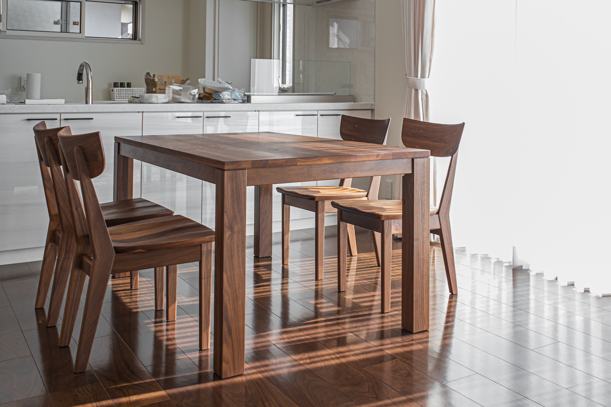 ブラックウォールナット無垢材のダイニングセットをお届けしました。直線的なデザインのテーブルには同じデザインの椅子を4脚合わせていただき、フォーマルな印象に仕上がっています。高級感のあるブラックウォールナットの魅力をふんだんに引き出すダイニングスペースになりました。