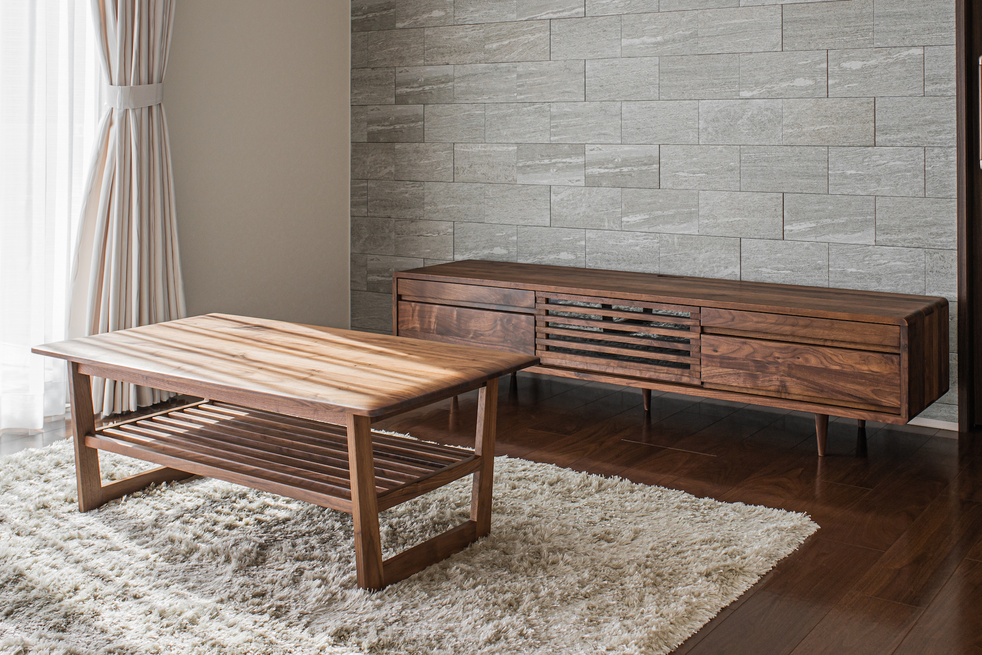 リビングスペースも、同じくブラックウォールナット無垢材で統一してお選びいただきました。テレビボード背面のデザインウォールとも相性抜群!ダーク色のフローリングとも良く合っていて、落ち着いた印象のリビングスペースになりました。