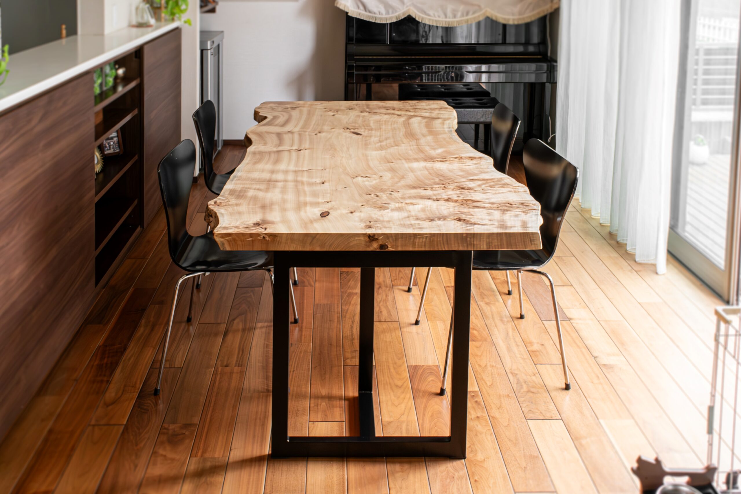 ポプラ一枚板のダイニングテーブルをお届けしました。一度見たら忘れられないインパクトがあるものの、大判の板がなかなか市場に流通しないことで有名なポプラ材。こちらは幅1800ミリ、奥行きは1000ミリ前後の非常にボリュームのある一枚です。ポプラ特有の瘤(こぶ)がいたるところに入っており、ダイナミックな造形は唯一無二の存在感がありますね。