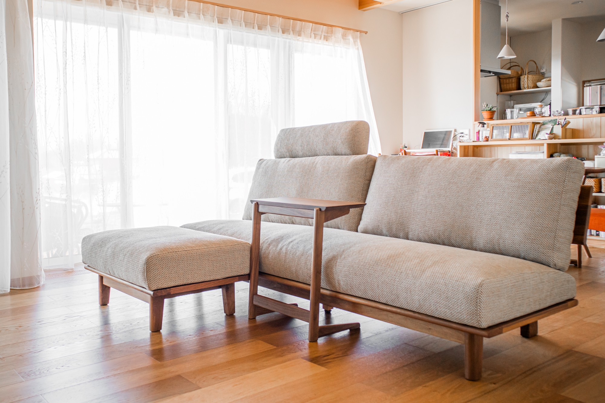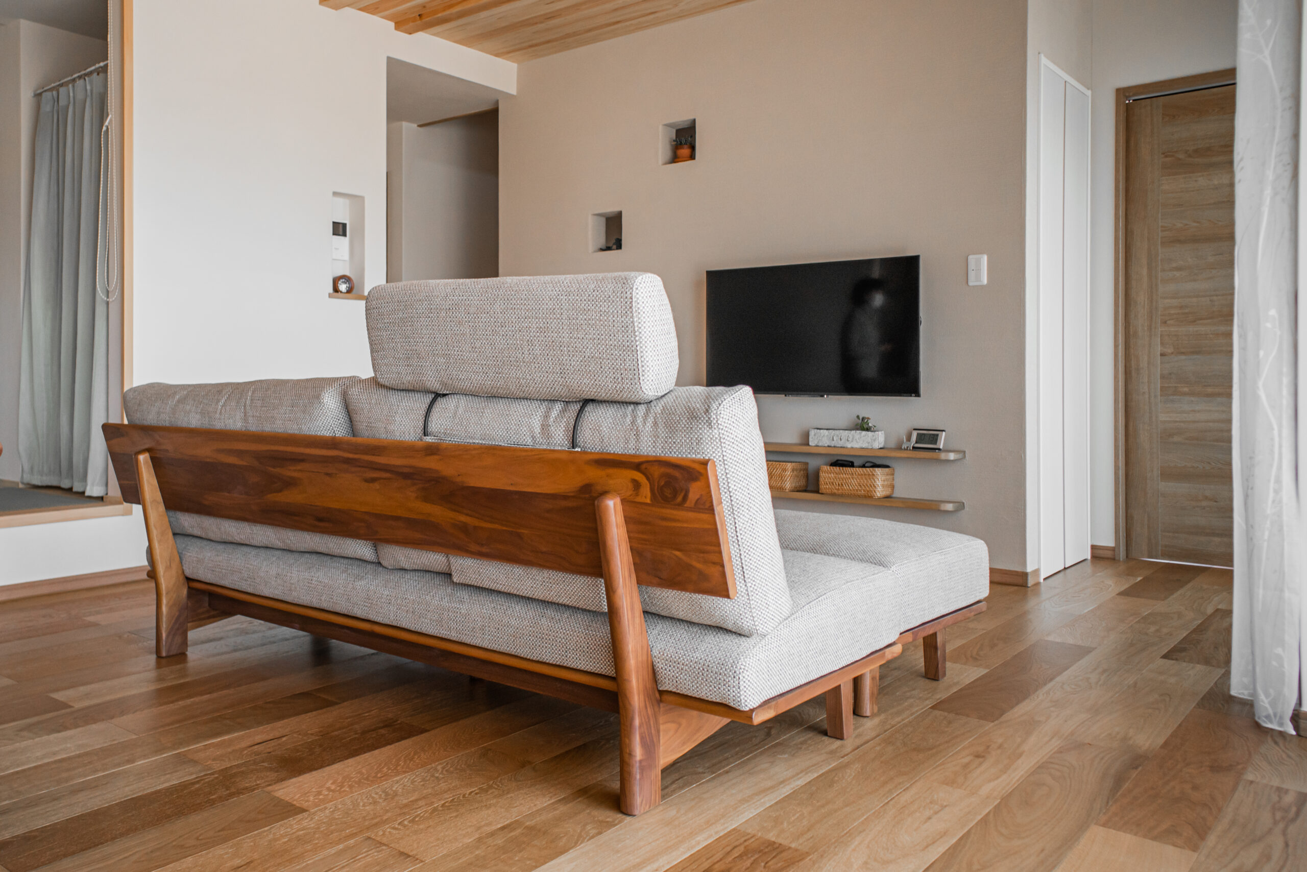 ブラックウォールナット無垢材のソファをお届けしました。幅2000ミリを超えるサイズですが、アームレス(肘なし)タイプのフレームですっきりとした印象に仕上がっています。正面から見たときの豪華な印象もさることながら、背面から見た時にも美しい長尺の無垢材に目を奪われる素敵な一品です。