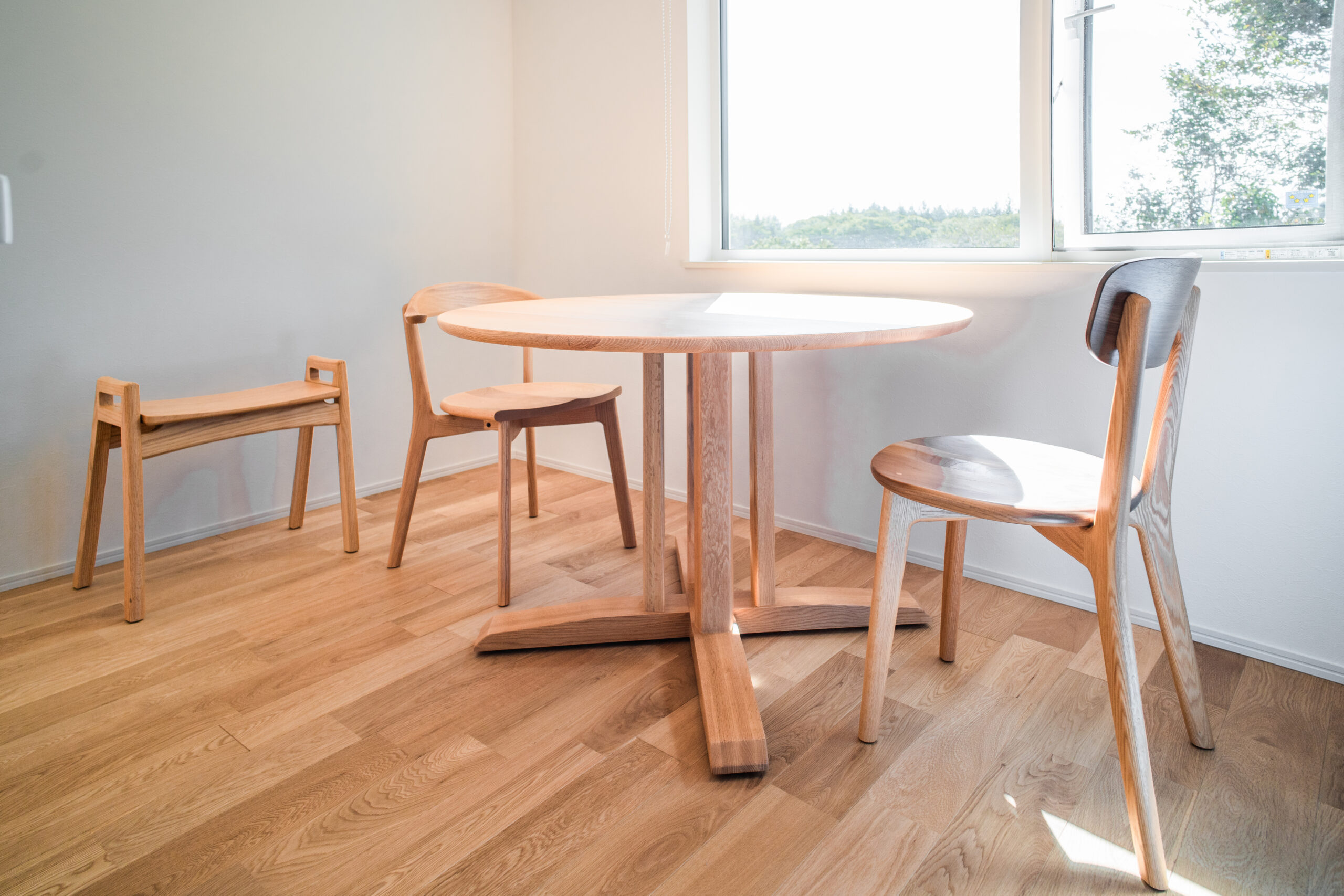 オーク(ナラ)無垢材のダイニングセットをお届けしました。キッチン横のスペースを活かした丸テーブルは可愛らしいデザインながらも、脚の造作や天板の木目の通し方などのつくりは一級品。椅子もデザイン違いでお選びいただき、高品質かつデザイン性に富んだ空間に仕上がりました。