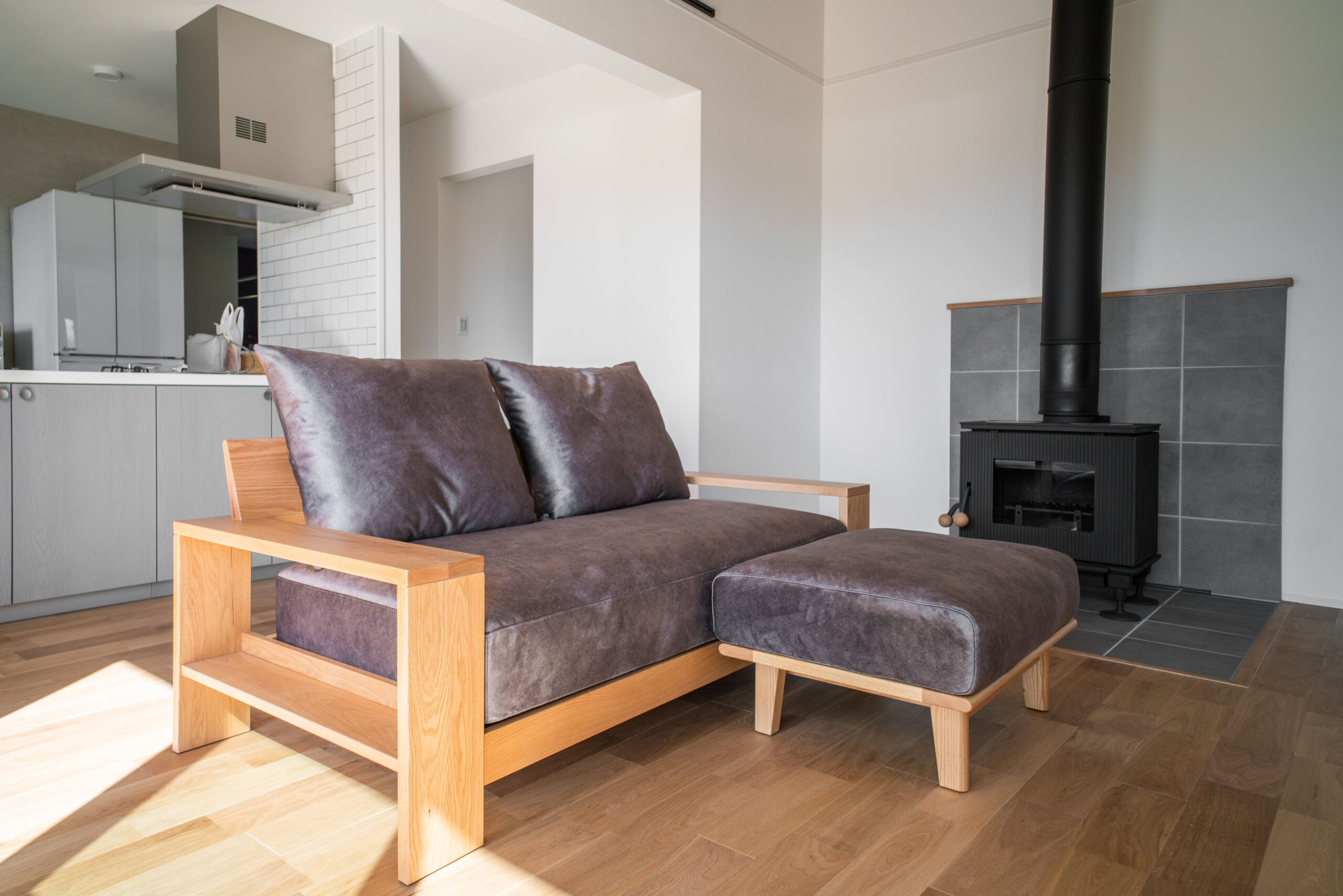 リビングスペースには、同じくオーク(ナラ)無垢材のソファ&オットマンのセットをお選びいただきました。幅広の肘掛けが特徴的な、ボリューム感のあるフレームは迫力満点!分厚いウレタンフォームとフェザーを組み合わせえたクッションも贅沢な座り心地を味わえます。
