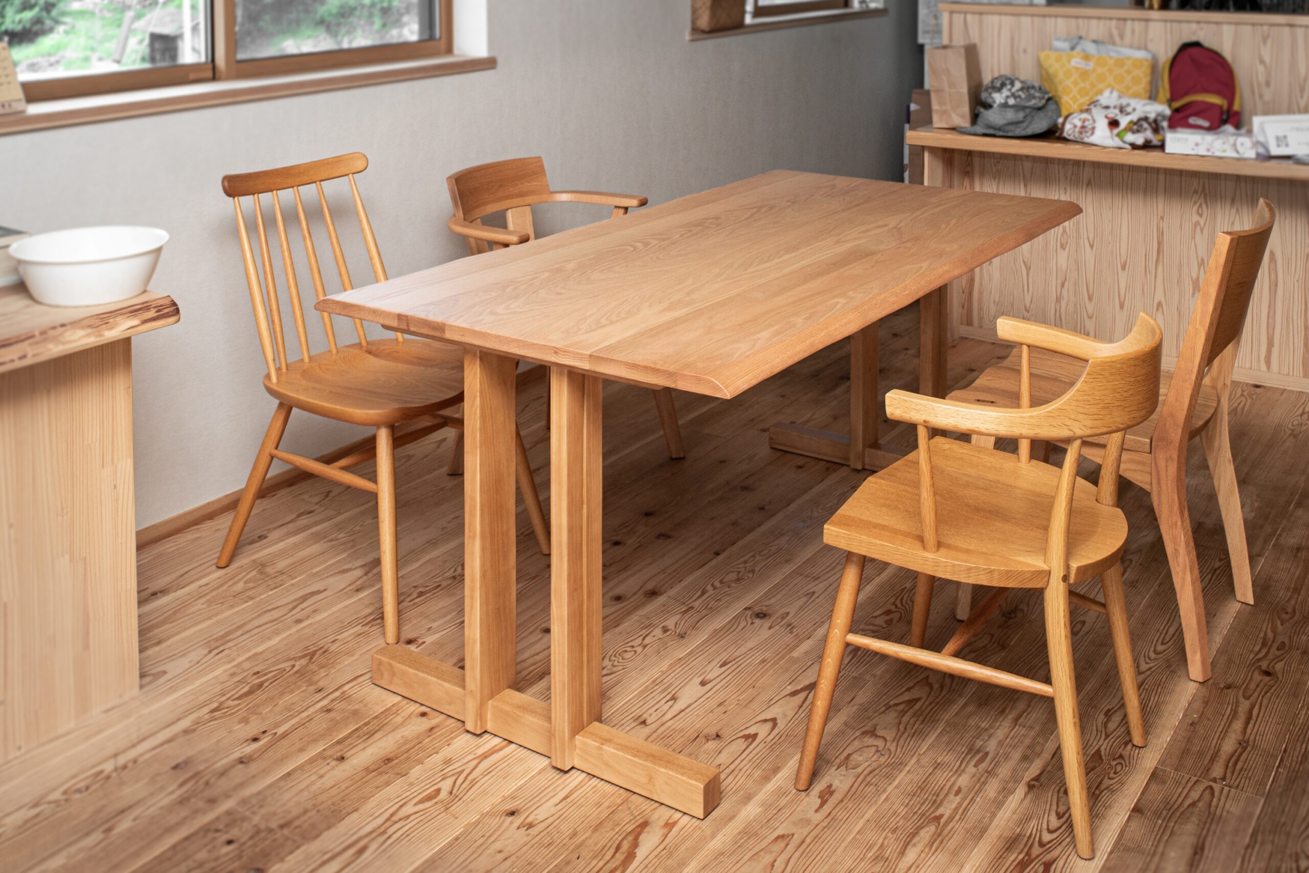 ナラ(オーク)無垢材のダイニングセットをお届けしました。オーク材特有の力強い木目と明るい色合いで、無垢材の質感を存分に楽しめる一品です。ダイニングチェアはデザイン違いで4脚お選びいただき、こだわりの詰まった空間に仕上がりました。