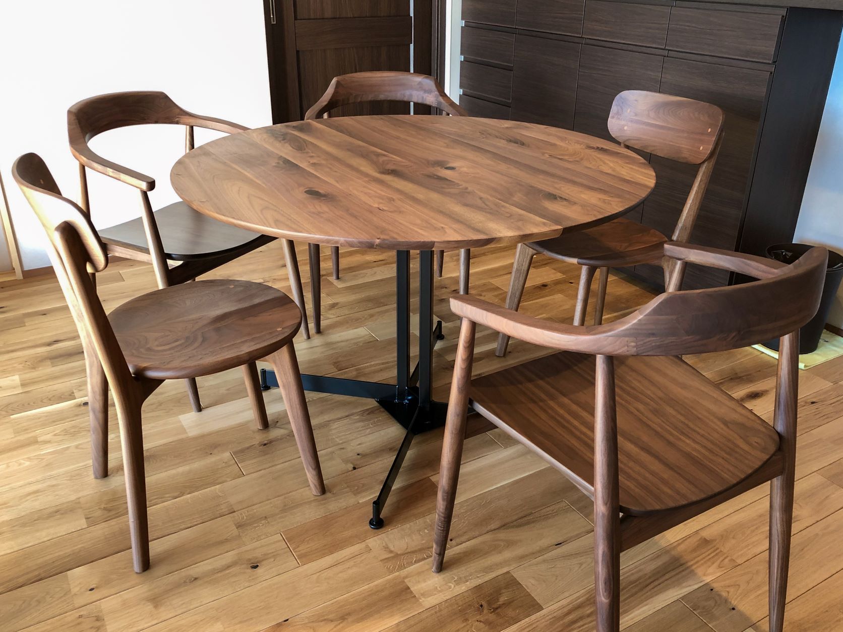 ブラックウォールナット無垢材のダイニングセットをお届けしました。直径1100ミリの使い勝手の良いサイズの天板に、椅子5脚とも素材を合わせてお選びいただきました。ブラックウォールナットで統一感もありつつ、椅子のデザインを2種類に変えることで固すぎない印象にまとまりました。