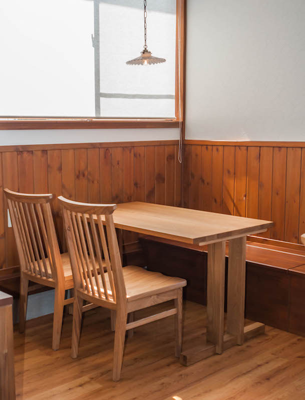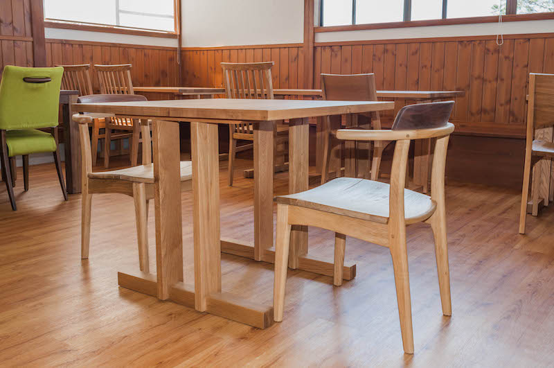 ホールには、ナラ(オーク)無垢材のオーダーテーブルをメインに使っていただいています。