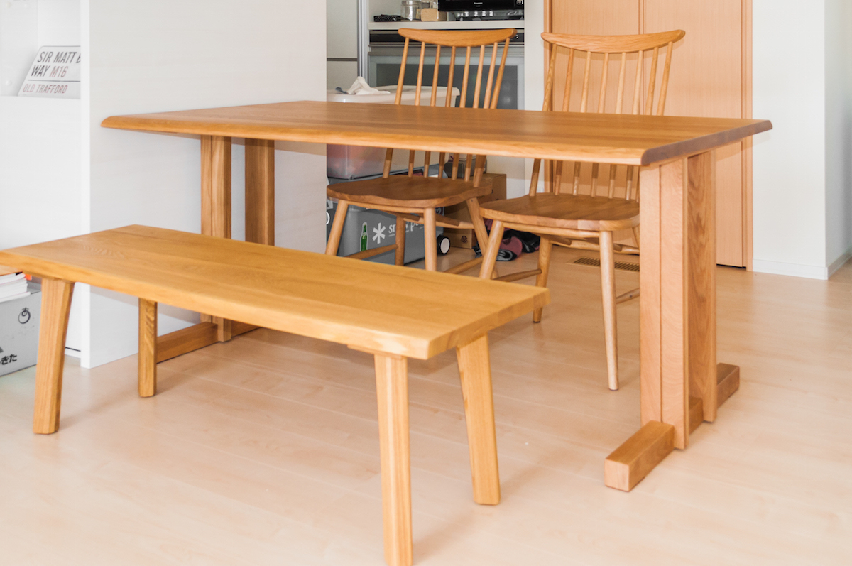 ナラ(オーク)無垢材のダイニングセットをお届けしました。ナラ特有の力強い木目を楽しめるシンプルなデザインのテーブルに、座り心地の良いスポーク状の背もたれが特徴的な椅子を組み合わせてお選びいただいきました☆