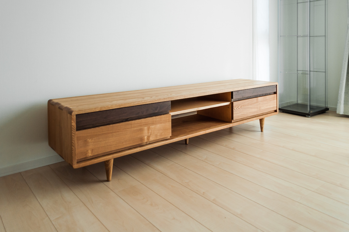 リビングルームには、タモ(アッシュ)無垢材とブラックウォールナット無垢材を組み合わせたテレビ台をお選び頂きました。こちらも、シンプルながら個性的なデザインで大人気のテレビ台です♪