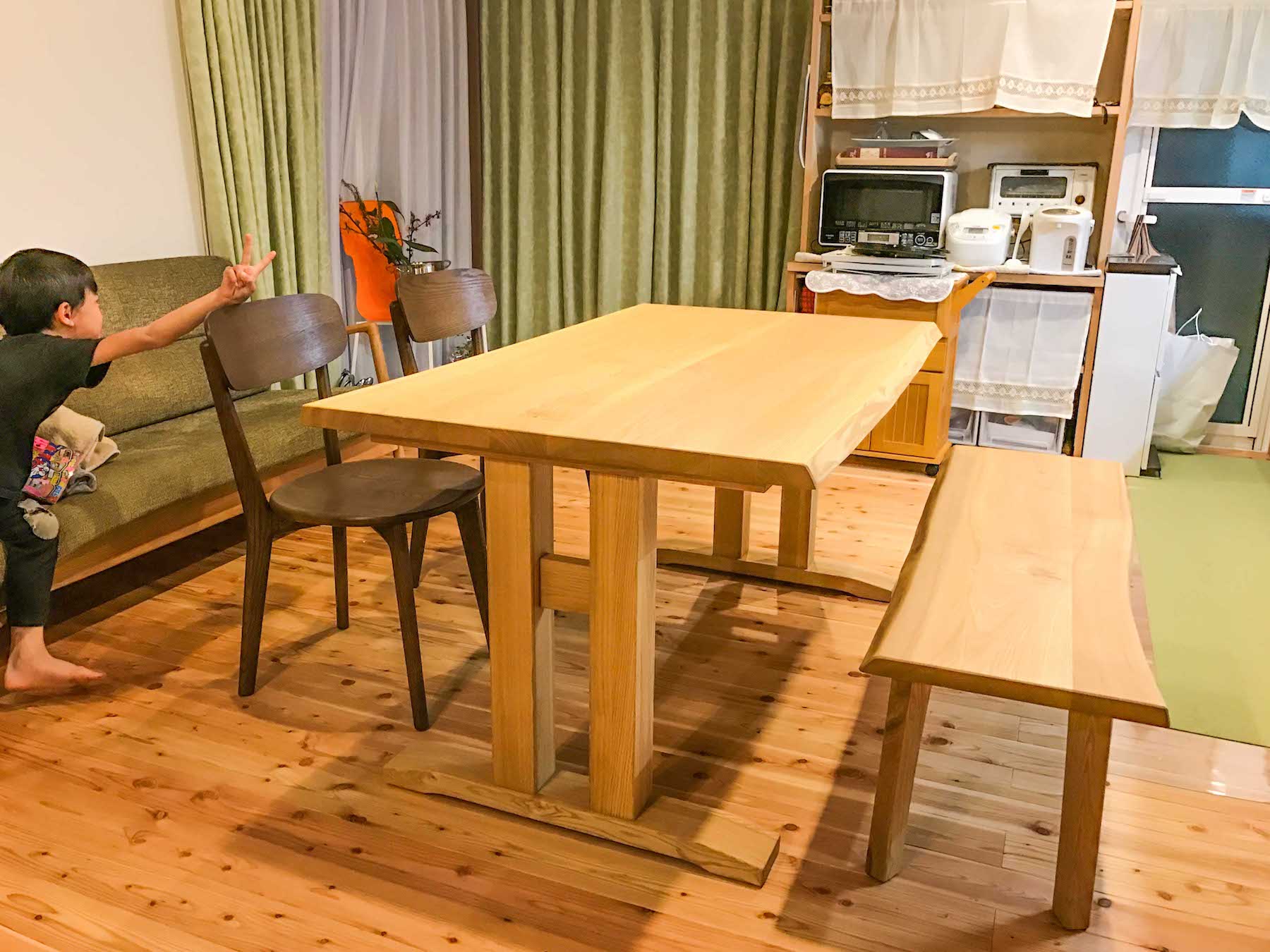 タモ(アッシュ)無垢材のダイニングセットをお届けしました。耳付きの天板に合わせていただいたのは、丸みを帯びた優しいデザインの椅子!天然木がふんだんに使われお部屋にぴったりの、可愛らしい組み合わせになりました。お子様も気に入ってくれたようで、ピースでお出迎えです(^^)
