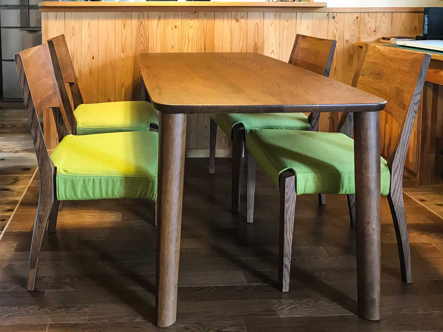 ナラ(オーク)無垢材のダイニングセットをお届けしました。落ち着いたダーク色で木目を綺麗に出し、若草色のカバーを合わせて重すぎない雰囲気にまとまりました!