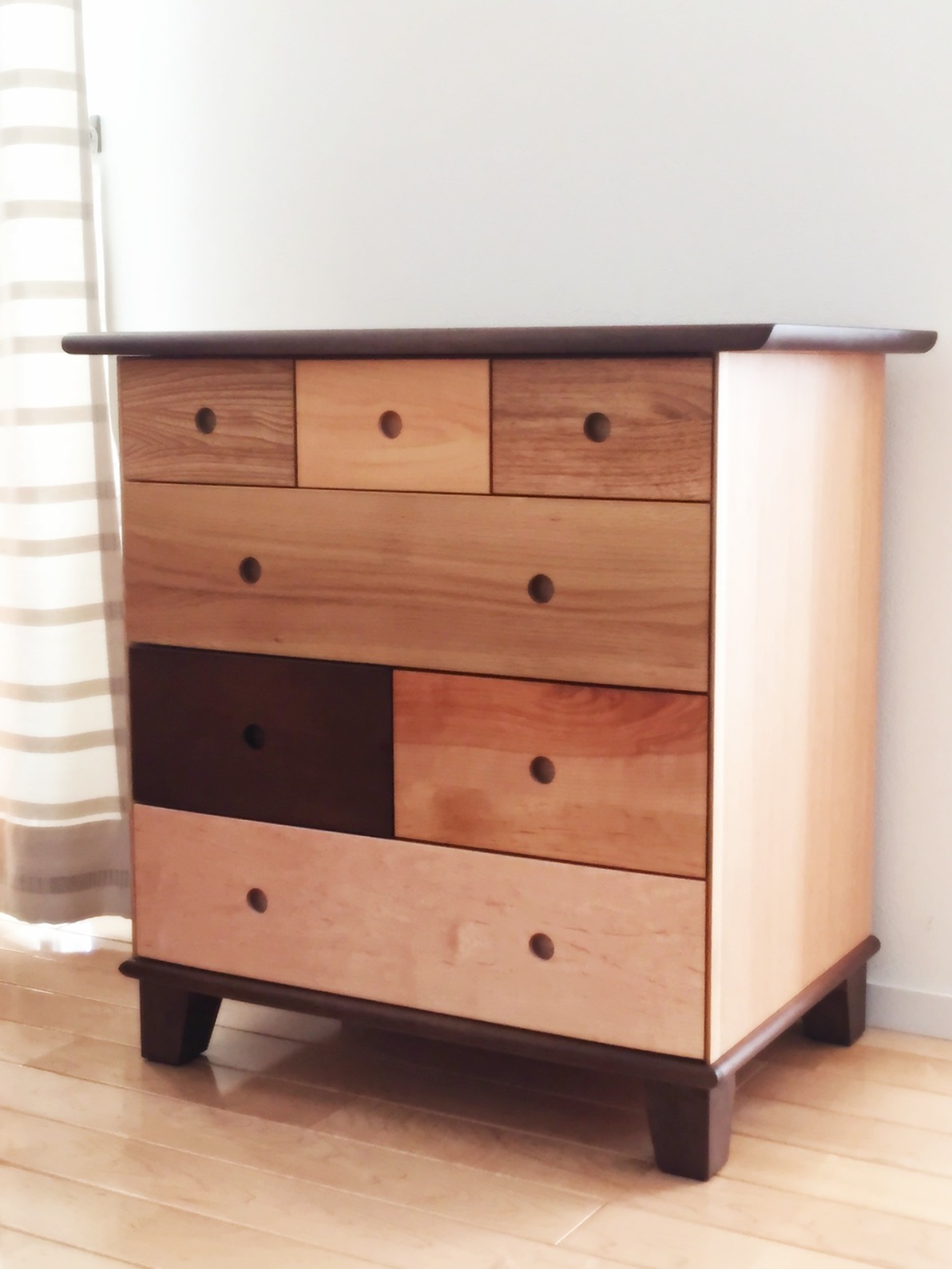 色々な天然木無垢材を組み合わせた前板が特徴的なチェストをお届けしました。