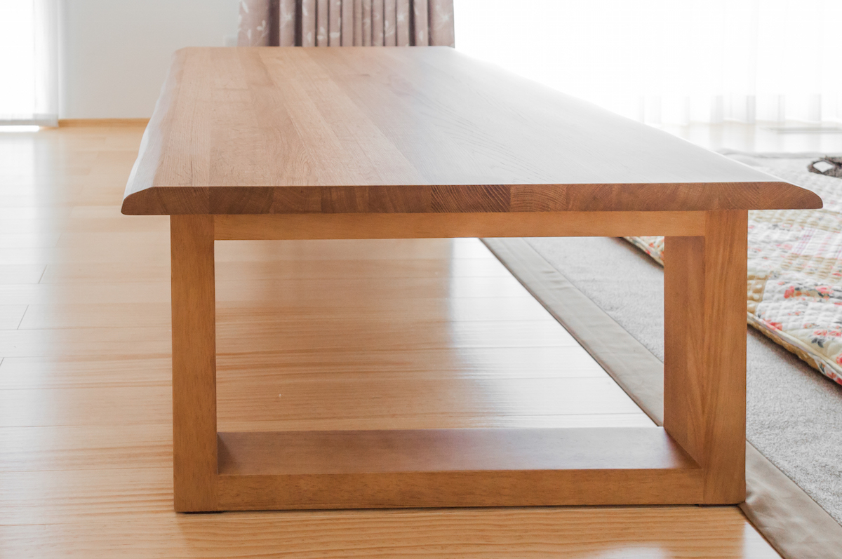 ナラ(オーク)無垢材のリビングテーブルをお届けしました。ダイニングテーブルとしても使えるサイズの天板に、低めの脚を合わせてご用意した形です。明るい色としっかりした木目で天然木の風合いを楽しみつつ、すっきりしたデザインで若い方にも人気です!