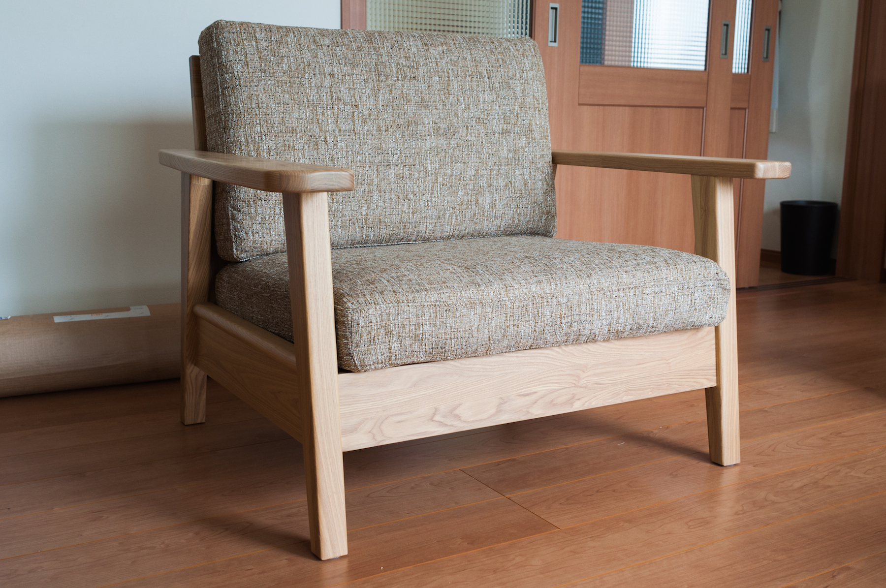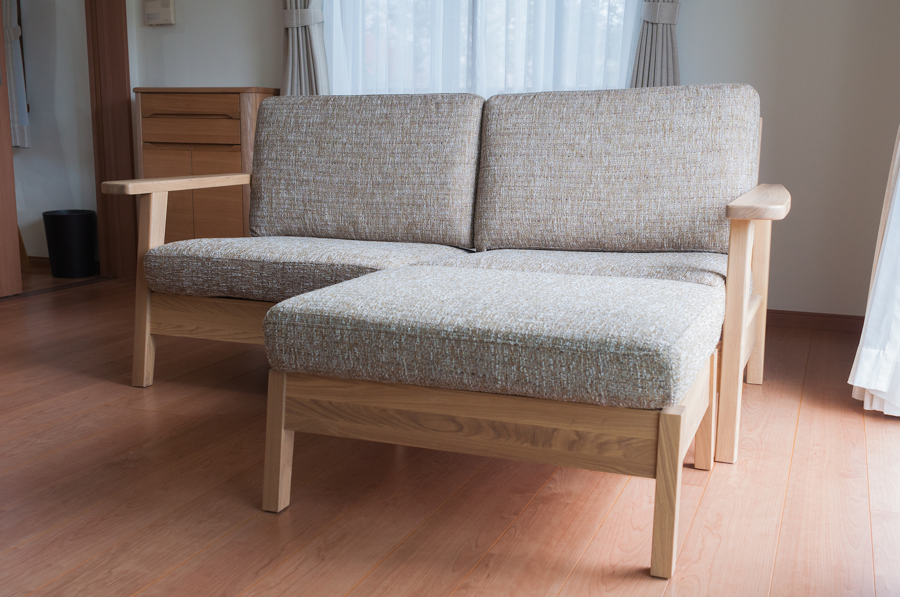 ナラ(ホワイトオーク)無垢材×カバーリングクッションのソファとスツールです。