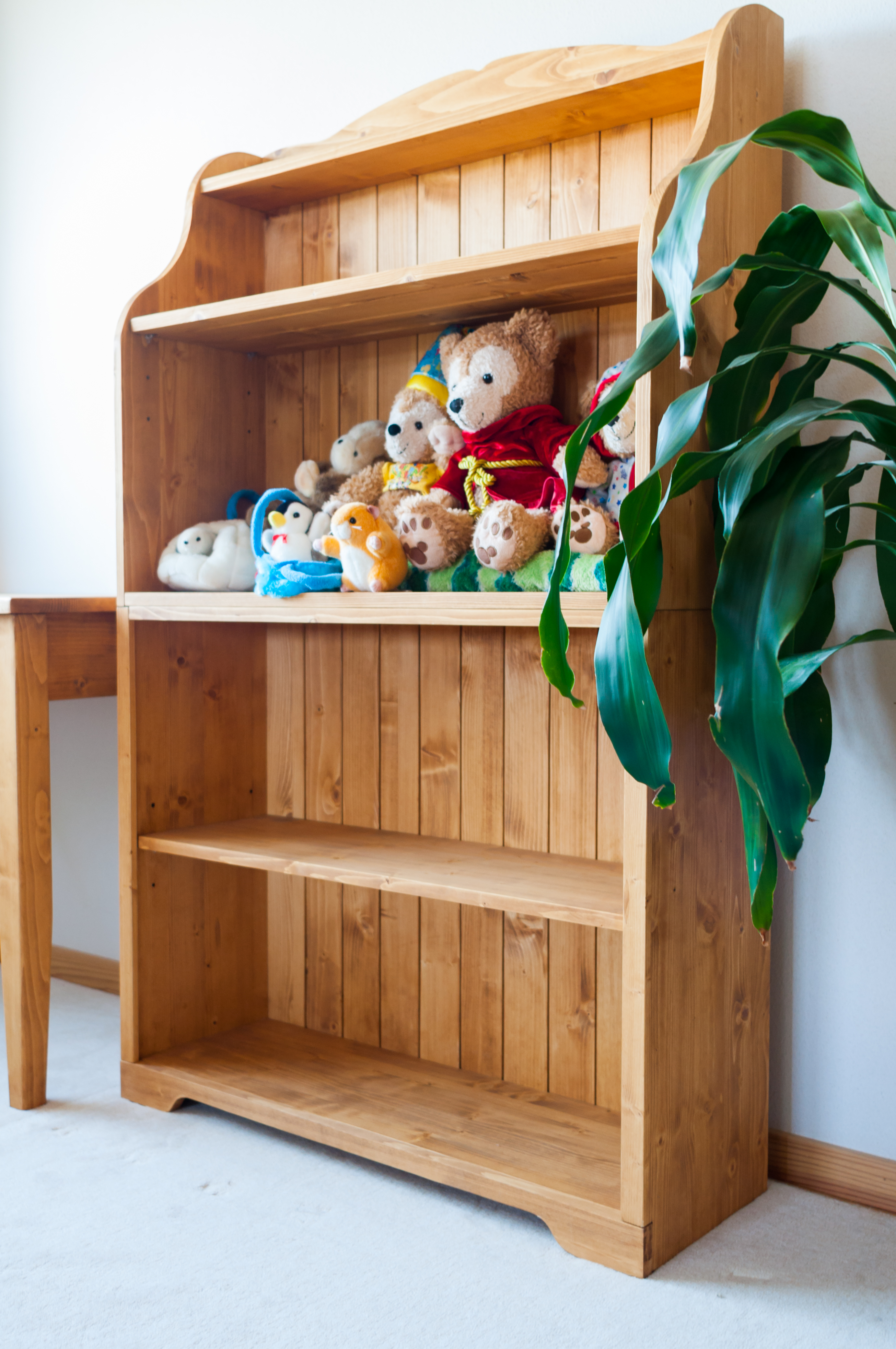 一枚ずつ丁寧にはめ込まれた背板がカントリーな雰囲気をぐっと引き立てます♪ 早速ぬいぐるみたちを並べて、お気に入りのスペースになりました☆