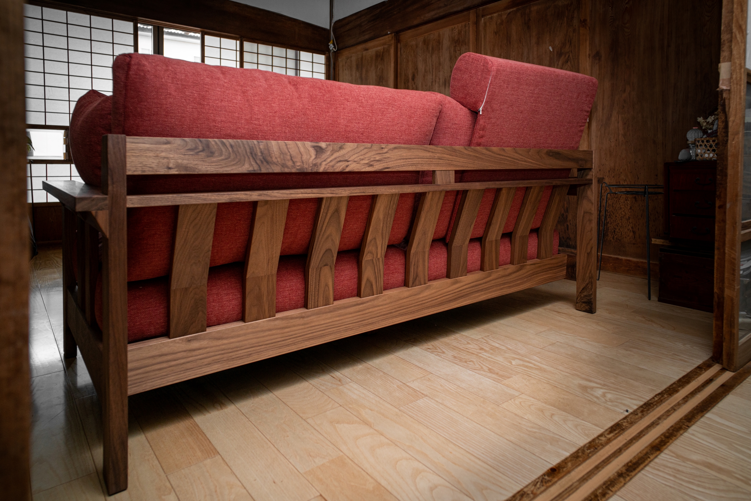 ブラックウォールナット無垢材のソファをお届けしました。背面のデザインが特徴的な無垢材のフレームは、洋間だけでなく和風の空間にもとても良く似合います。日本が誇る木工技術が詰め込まれたこだわりのフレームと、スモールフェザーのクッションの座り心地が融合したハイエンドモデルならではの迫力が満喫できる一品です。