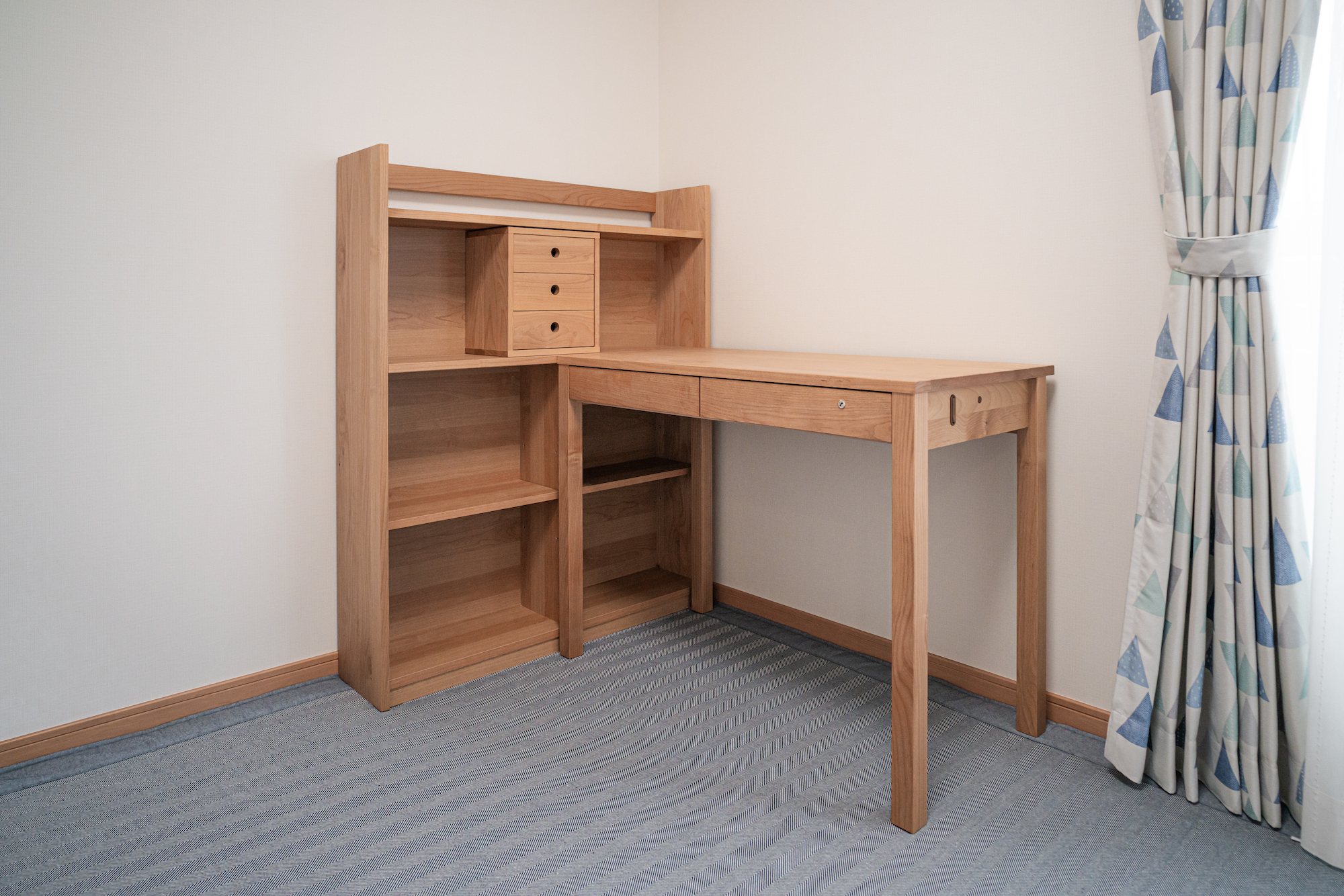 アルダー無垢材のデスクセットをお届けしました。デスクと本棚、それぞれ単体でも使えるシンプルな組み合わせが大人の方にもご好評です。L字に配置することでお部屋も広々使えますね!