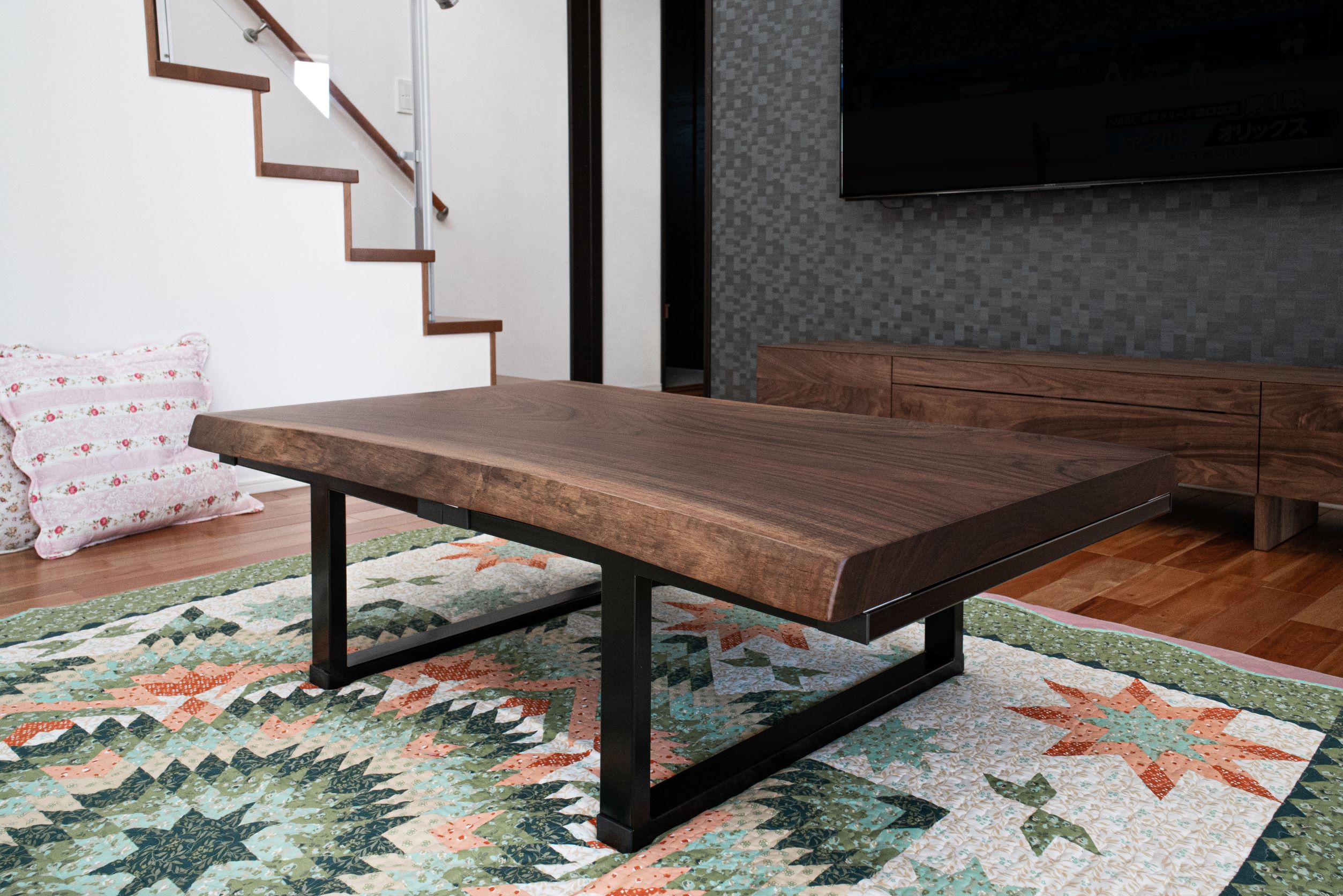 ブラックウォールナット一枚板のセンターテーブルをお届けしました。一枚板としてはやや小ぶりなサイズながらも、天然の耳(丸太の表面)や板の厚みは、やはり目を惹く存在です。スチールの脚も質量感があって格好いいですね!