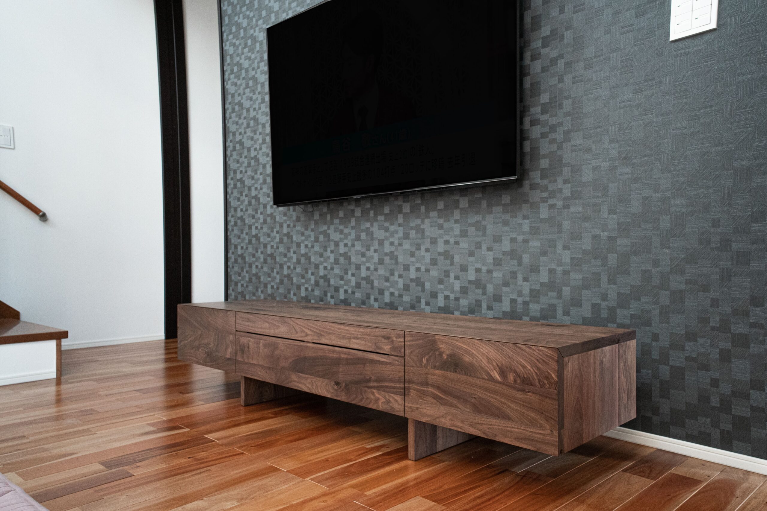 こちらはブラックウォールナット無垢材のテレビボードです。幅1800㎜のサイズと、無垢材ならではの重厚感が迫力たっぷり!すっきりした直線的な造形は、壁掛けテレビの足元を飾るのにも最適です。