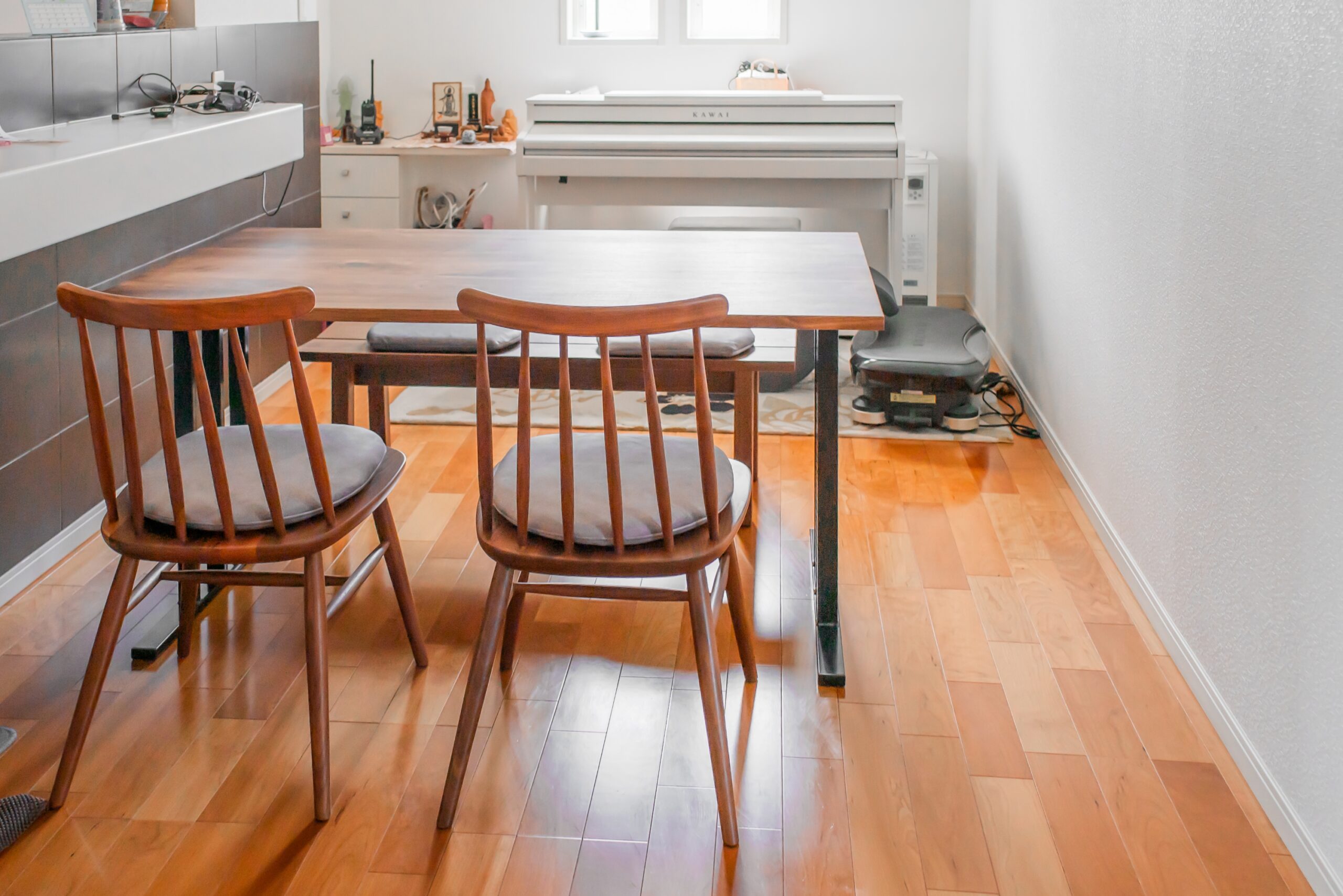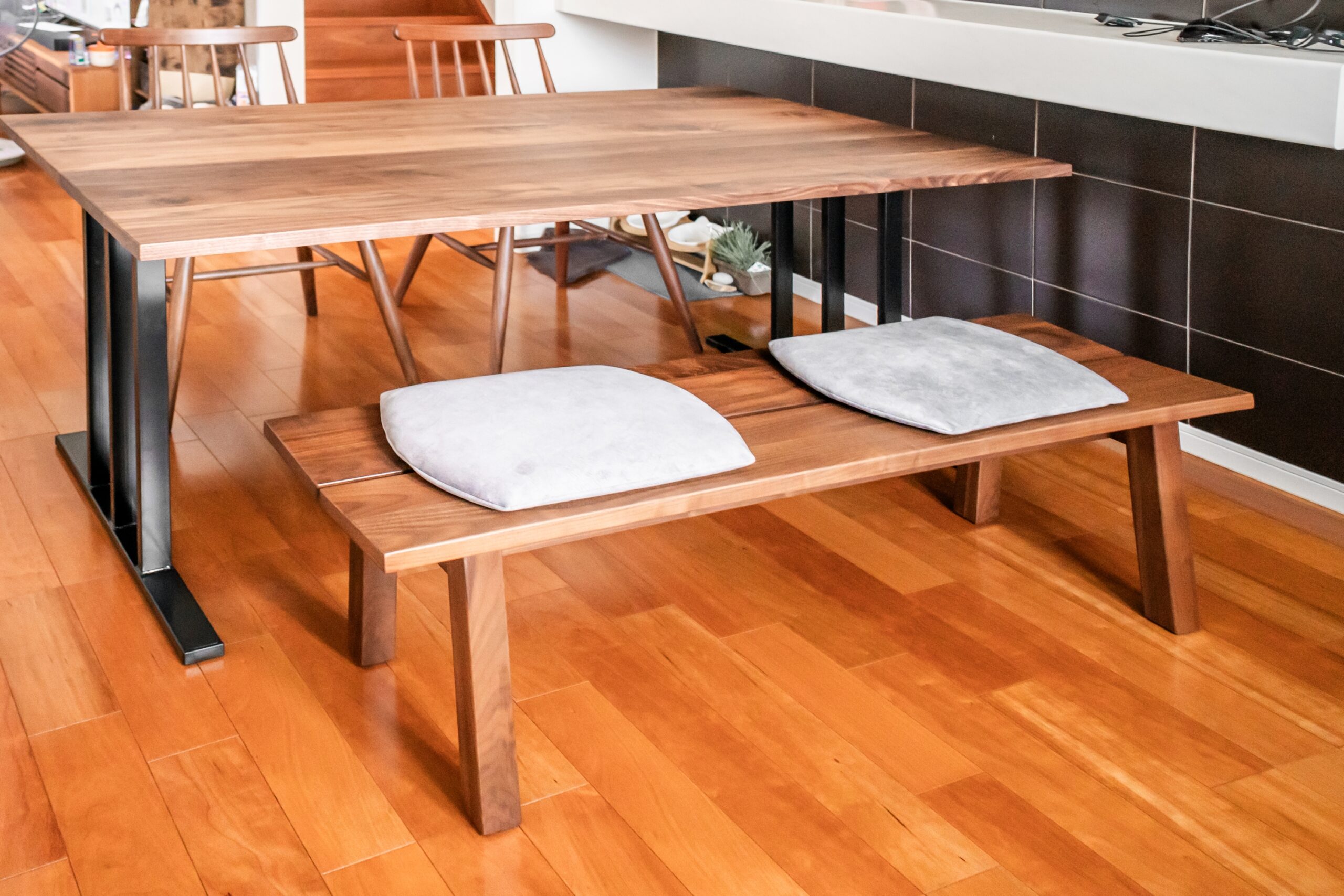 ブラックウォールナット無垢材のダイニングセットをお届けしました。すっきりとした直線的なデザインの天板に、細めのスチール脚がよく似合います。チェアとベンチにはそれぞれ座面用のクッションも合わせてお選びいただき、実用性に加えて高級感もアップした仕上がりになりました。