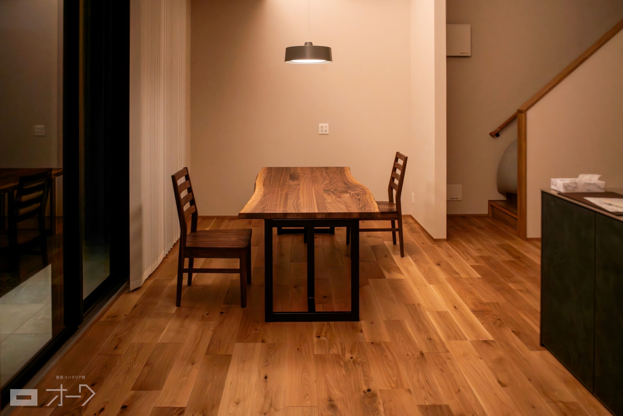 ブラックウォールナット無垢材のダイニングセットをお届けしました。テーブルには樹皮の表情をそのまま用いた耳付き天板をお選びいただき、幅1850㎜の大判サイズで迫力のある一枚に仕上がっています。椅子も同じくブラックウォールナット無垢材で統一し、間接照明を用いた落ち着きのある空間に良く似合う高級感たっぷりのダイニングセットになりました。
