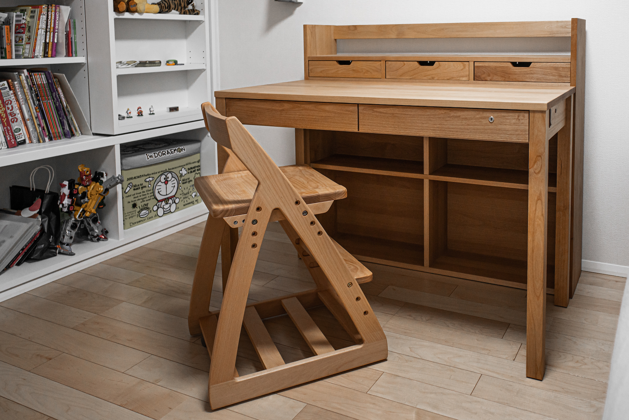 アルダー無垢材のデスクセットをお届けしました。コンパクトなサイズで省スペースに使えるのが人気のデスクです。本棚とデスクは単体でも十分に使っていただけるデザインなので、大人になってからも末長くご愛用いただけます。シンプルなので飽きがこないのも嬉しいポイントです。