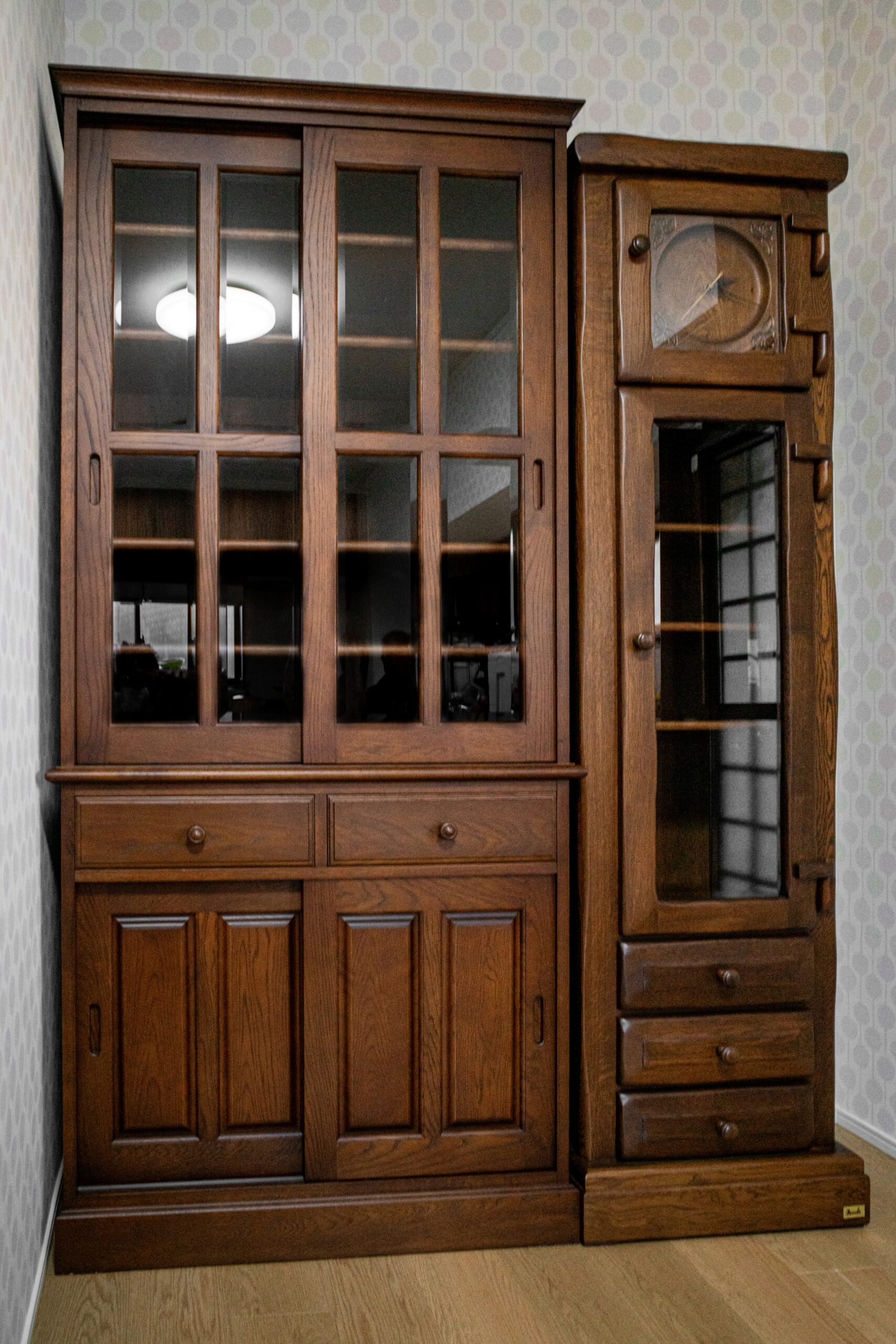 ナラ(オーク)無垢材の食器棚&時計付きキャビネットをお届けしました。ダーク色で仕上げたクラシックな雰囲気は、重厚感があって格好いいですね!ガラス部分には面取りが施され、細かい部分のデザインも奥行のある仕上げになっています。