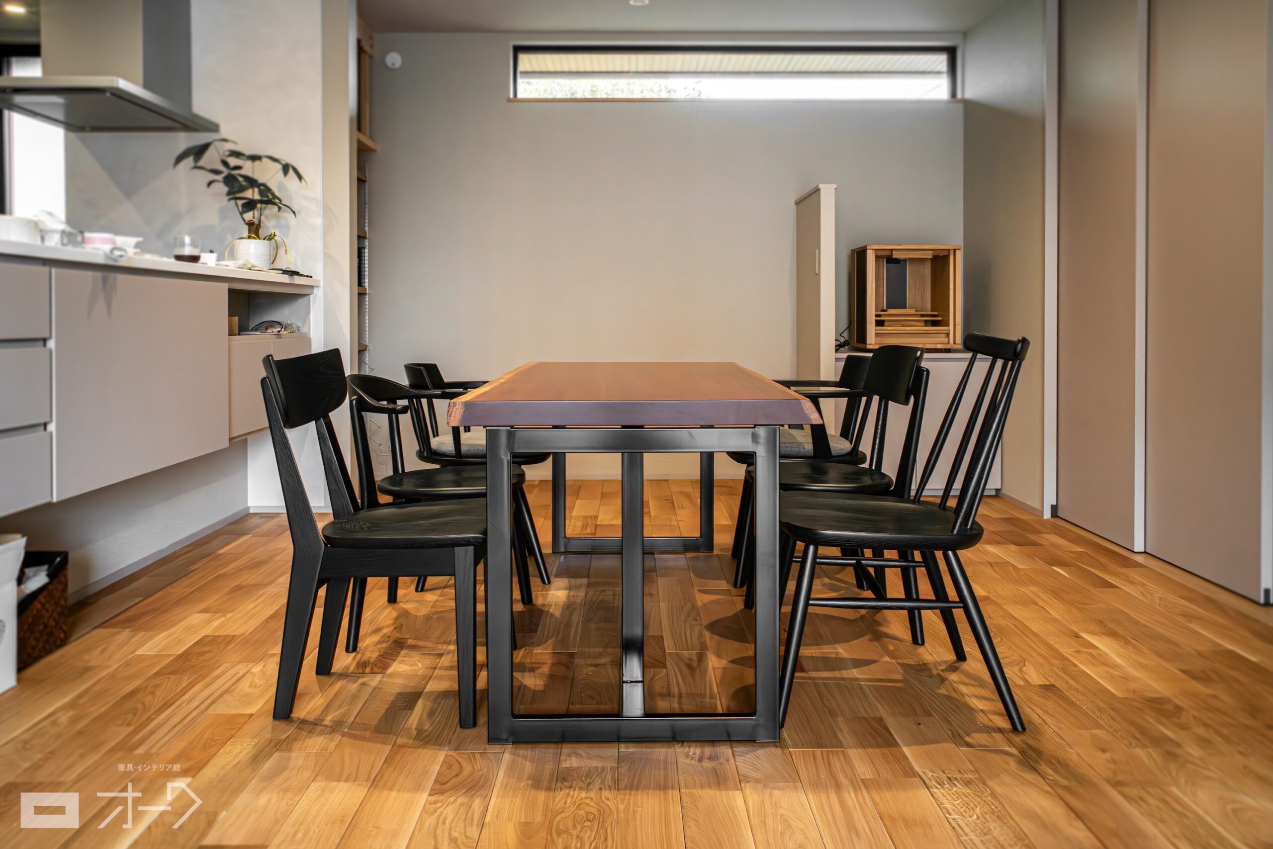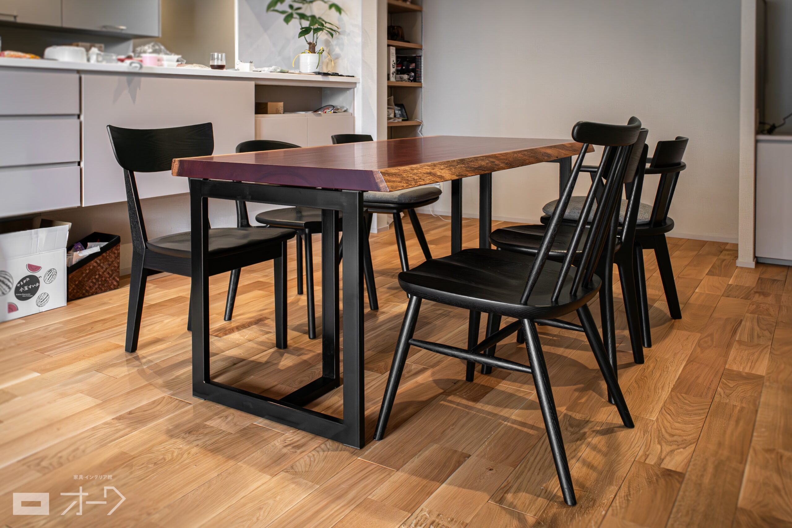 パープルハートの一枚板と、ナラ(オーク)無垢材ブラック塗装のチェアをお届けしました。美しい発色の紫色は天然の色合いで、人工塗料とは違って時間が経っても退色することはありません。デザイン違いの椅子をブラック塗装で統一し、リズム感がありつつも引き締まった印象にまとまりました。