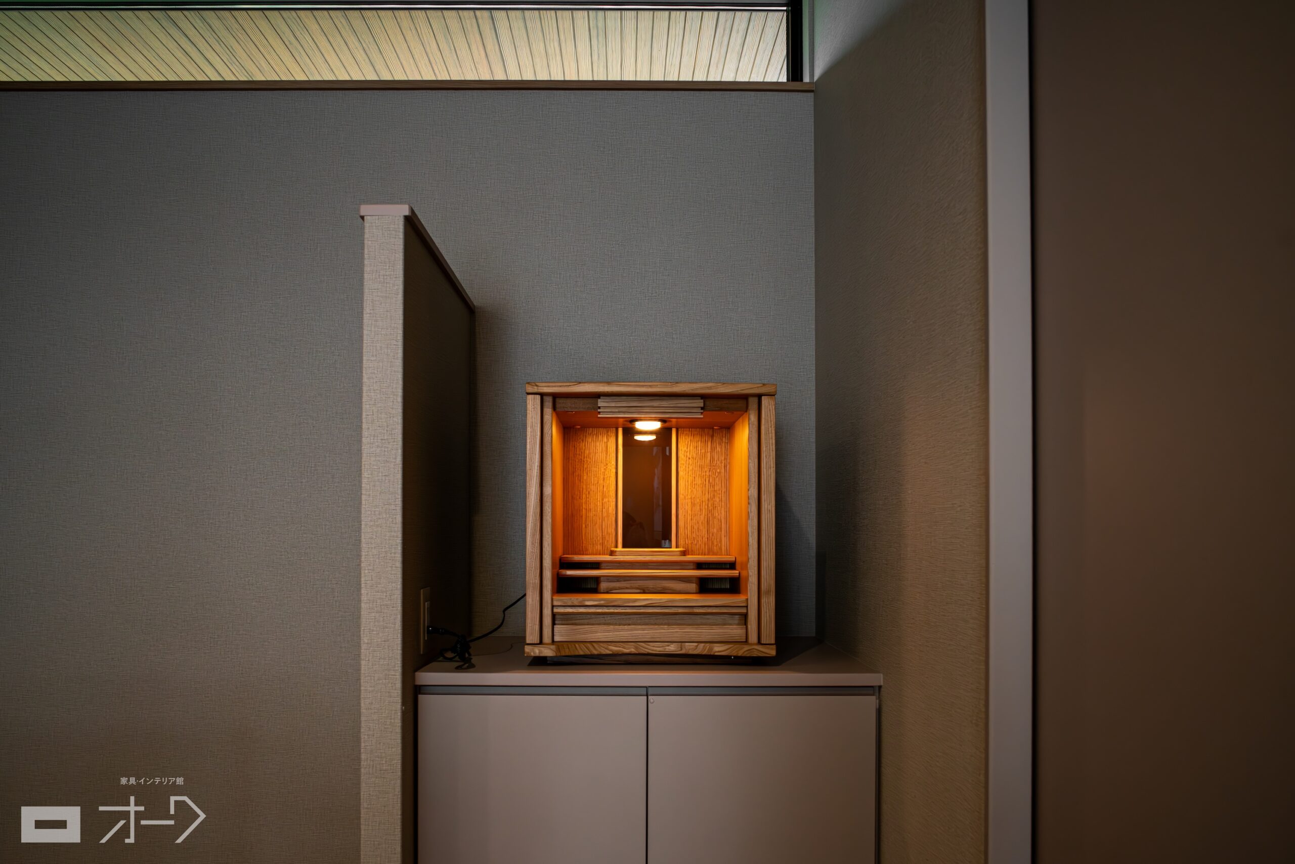 LDに設けられたお仏壇スペースには、コンパクトな卓上仏壇をお選びいただきました。デザイン性が高く、お仏壇とは思えないお洒落な佇まいが特徴の一品です。