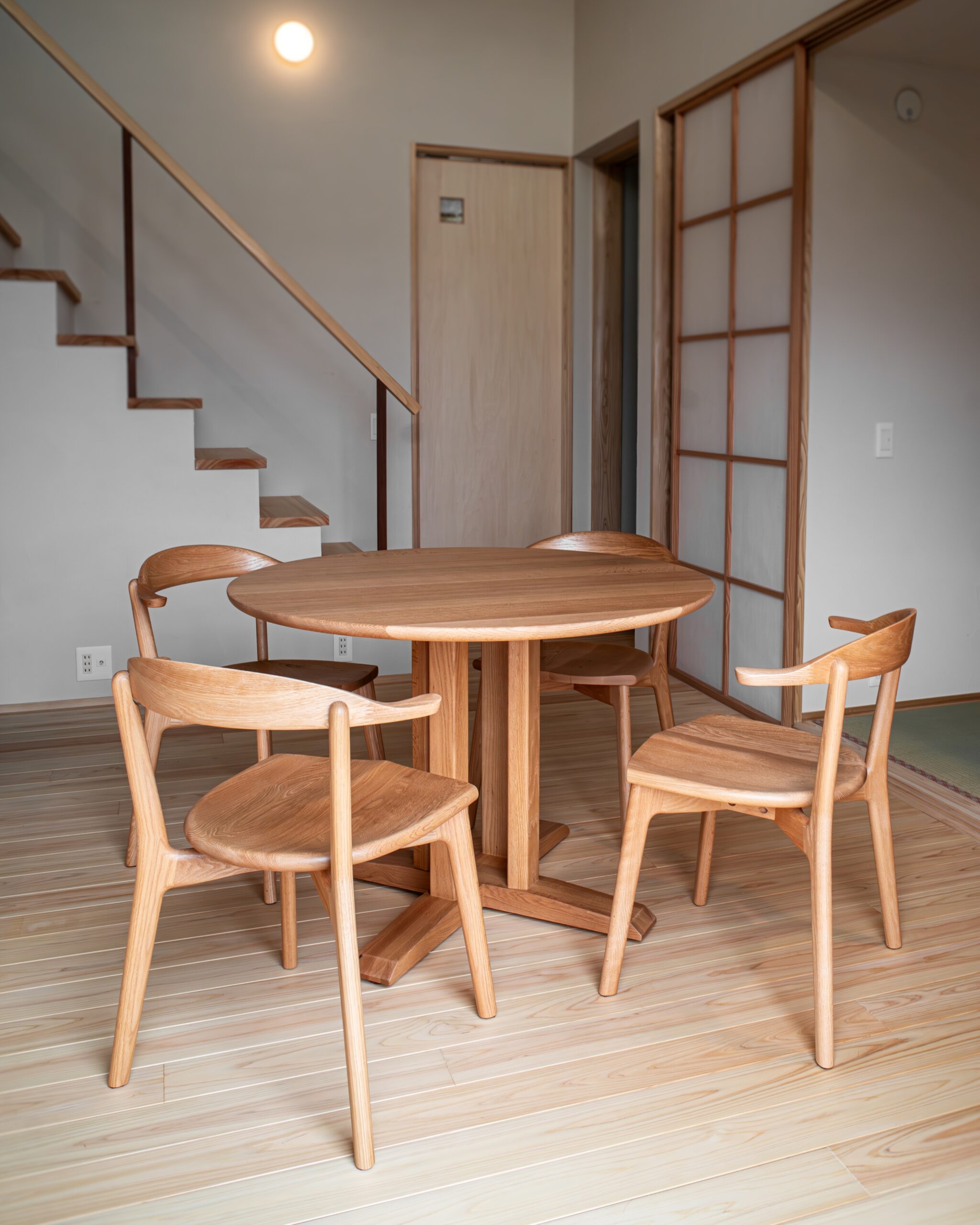 ナラ(オーク)無垢材のダイニングセットをお届けしました。お部屋の間取りに合わせてサイズをお選びいただいた丸テーブルと、デザインを統一した椅子を4脚合わせていただいて、ちょっぴり非日常的な空気の感じられる素敵な組み合わせに仕上がりました。