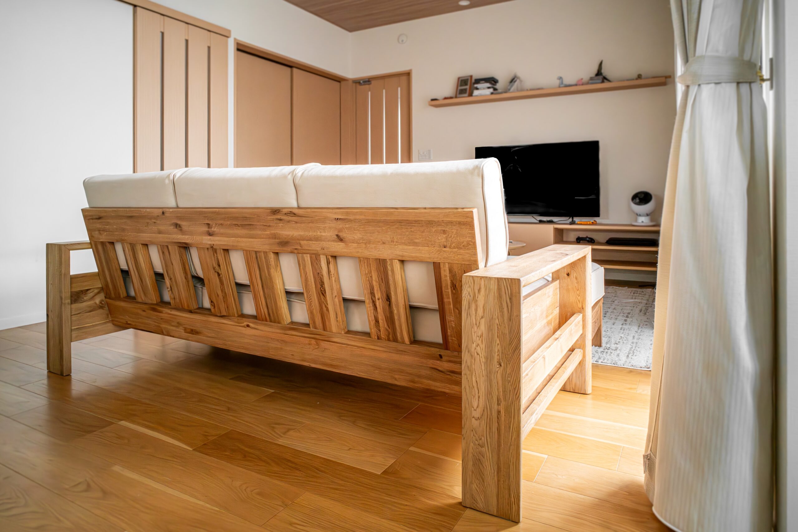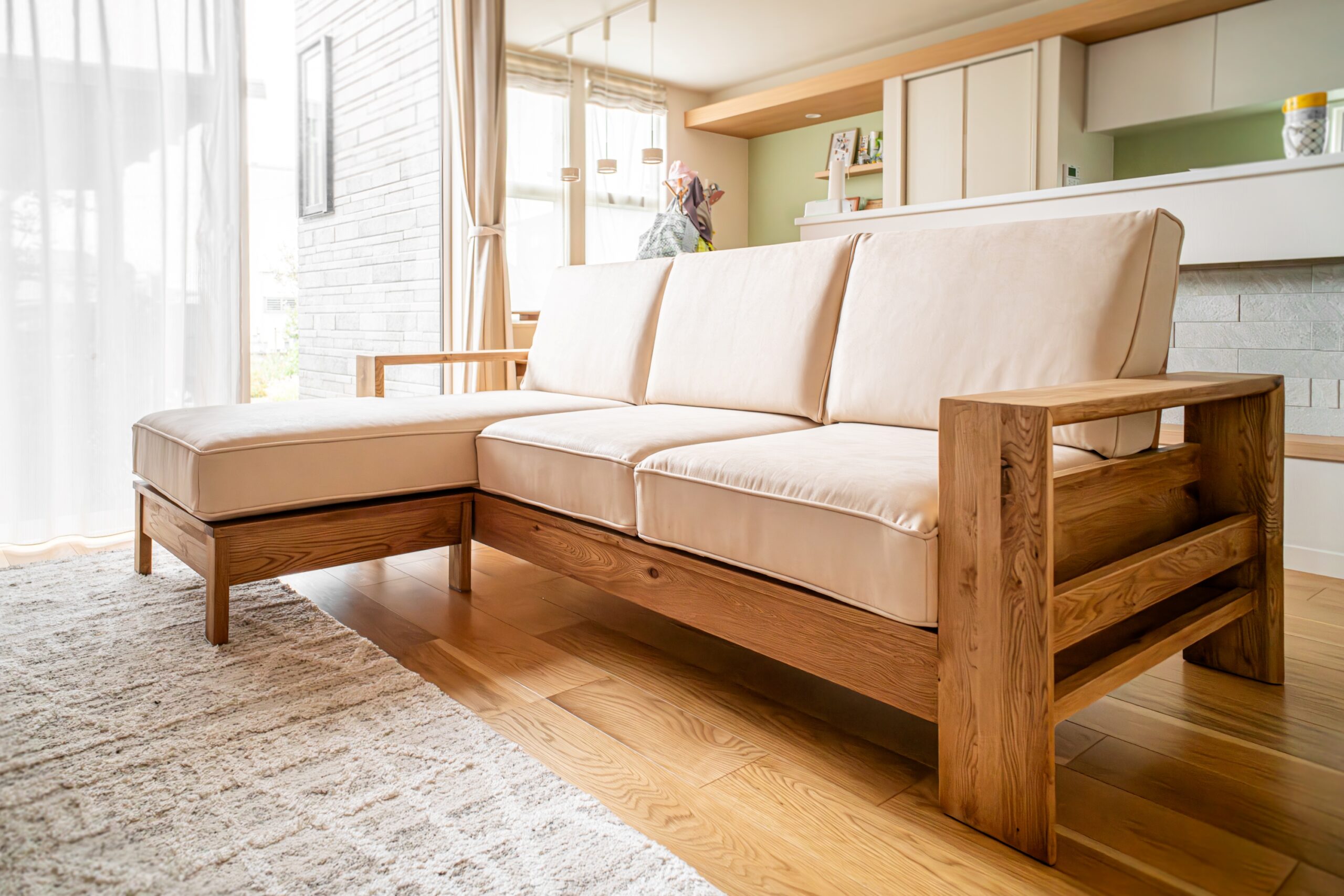 ナラ(オーク)無垢材のソファをお届けしました。幅広の部材をふんだんに使用したフレームで、贅沢な存在感のあるソファです。カウチ用クッションは配置を組み替えることで3人掛け+オットマンにすることもでき、使用シーンに合わせてレイアウトを変えることができるのも人気のポイント。カバーは壁紙の色合いに合わせて明るいベージュをお選びいただき、やさしい印象に仕上がりました。