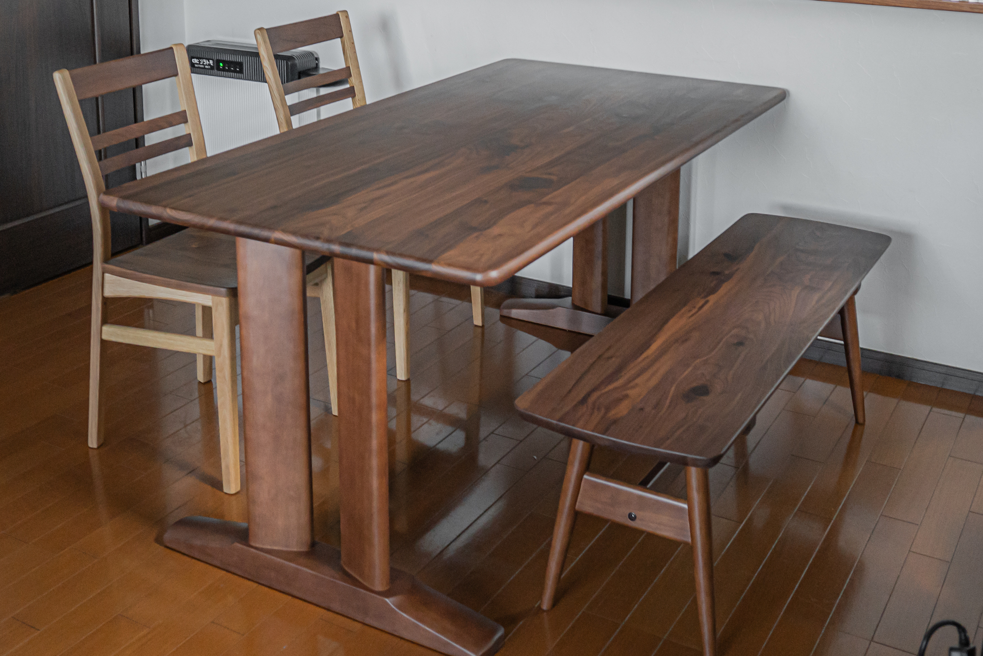 ブラックウォールナット無垢材のダイニングセットをお届けしました。テーブルとベンチの天板は、角を落として丸みのある優しいデザインに仕上がっています。椅子にはオーク材とコンビネーションのツートンカラーをお選びいただき、高級感がありながらも親しみやすい印象になりました。