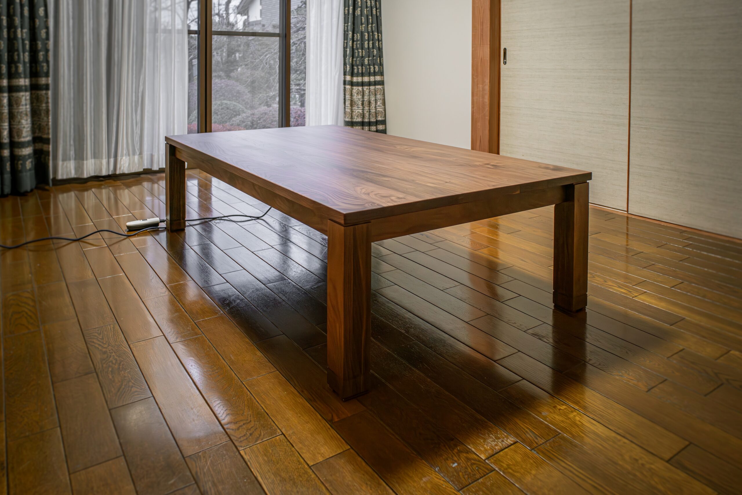 ブラックウォールナット無垢材のこたつをお届けしました。幅1500ミリの大型サイズは食事用の座卓としても申し分ない大きさで、総無垢の高級感とこたつに見えないデザインで一年を通して活躍してもらえる一品です。