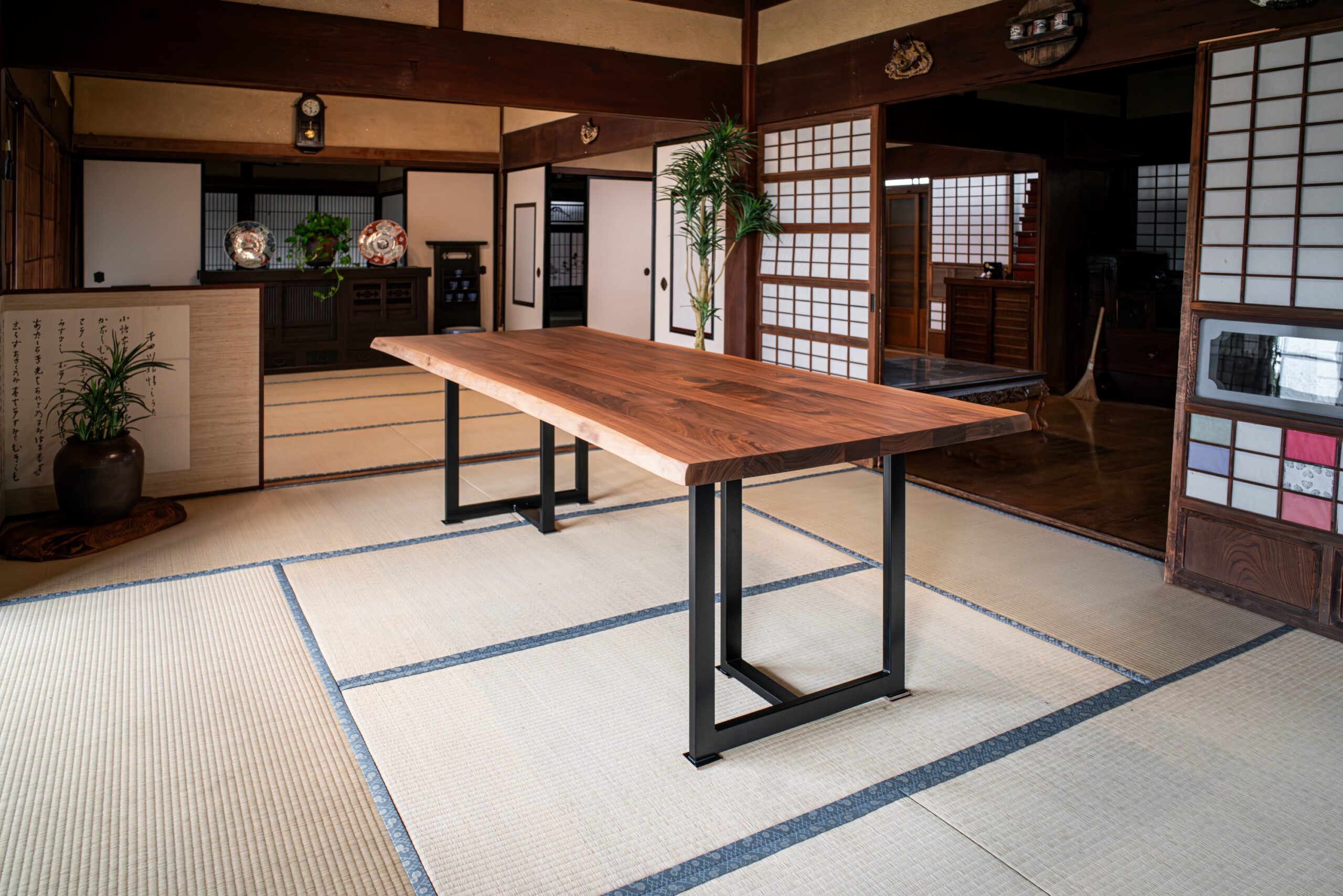 ブラックウォールナット無垢材のダイニングテーブルをお届けしました。古民家を改装してレストランを営業されるため、6~8人掛けで対応できる大判サイズの天板をお選びいただきました。厚み40ミリの耳付き天板で、趣のある空間に良く似合う、存在感のあるテーブルに仕上がりました。