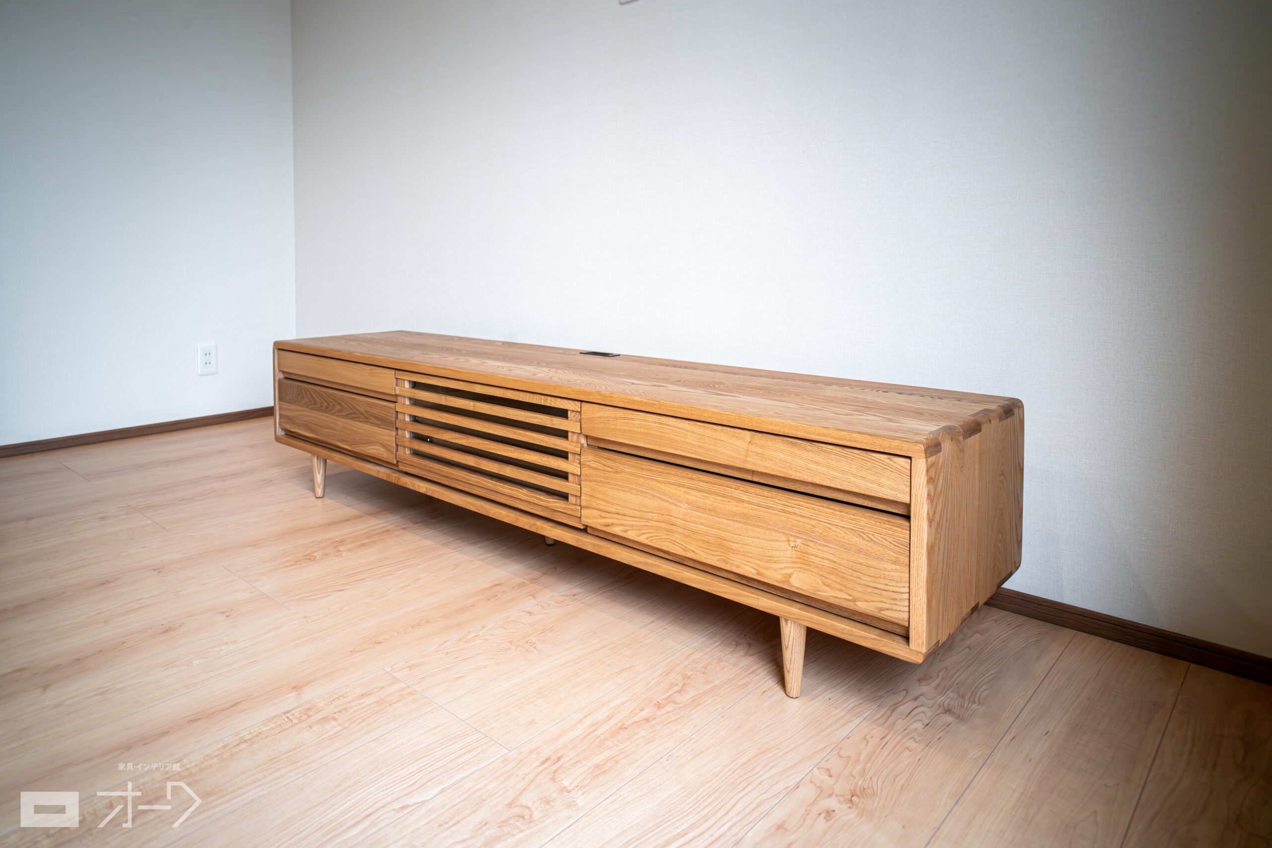 タモ(アッシュ)無垢材のテレビ台をお届けしました。幅1800㎜の大型サイズでありつつも、タモの明るい木目と、細部に丸みを帯びた造形で優しい印象に仕上がっています。左右の引出しは上下に分かれているので、収納が小分けにできるのも嬉しいポイントです。