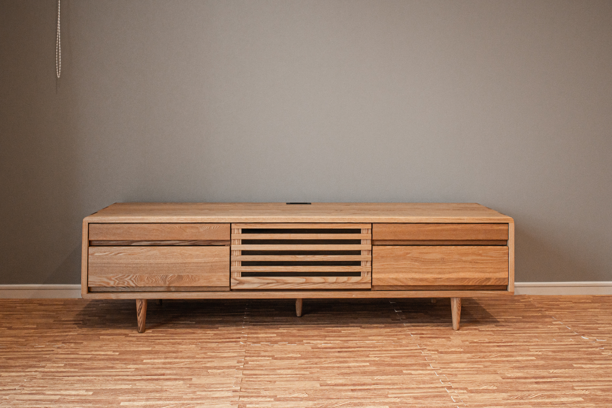 タモ(アッシュ)無垢材のテレビ台をお届けしました。グレーの壁紙を背景に、明るい木目がよく映えますね!ナチュラルな質感と丸みのあるデザインで、可愛らしい印象の一品です。