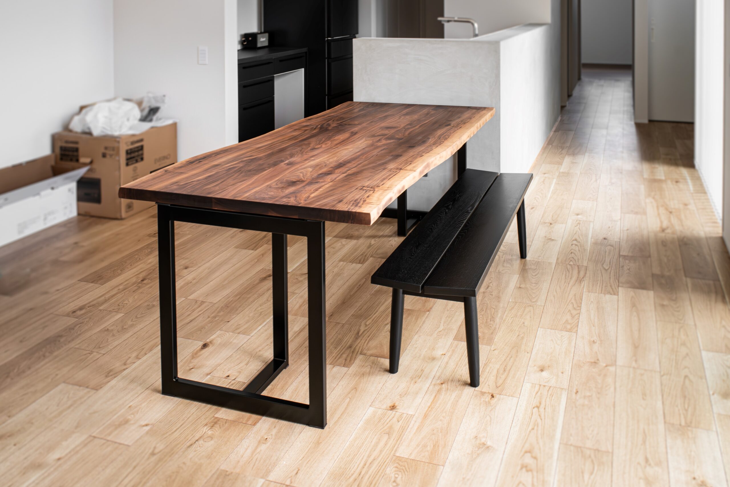 ブラックウォールナット無垢材のダイニングセットをお届けしました。天板は丸太の表面の部材を使用した“耳付き”と呼ばれる仕様をご指定いただき、幅2000ミリの大判サイズで大迫力の一枚です。ベンチは人気のブラック塗装をお選びいただき、自然の風合いとモダンな印象が組み合わさったスタイリッシュな印象に仕上がりました。