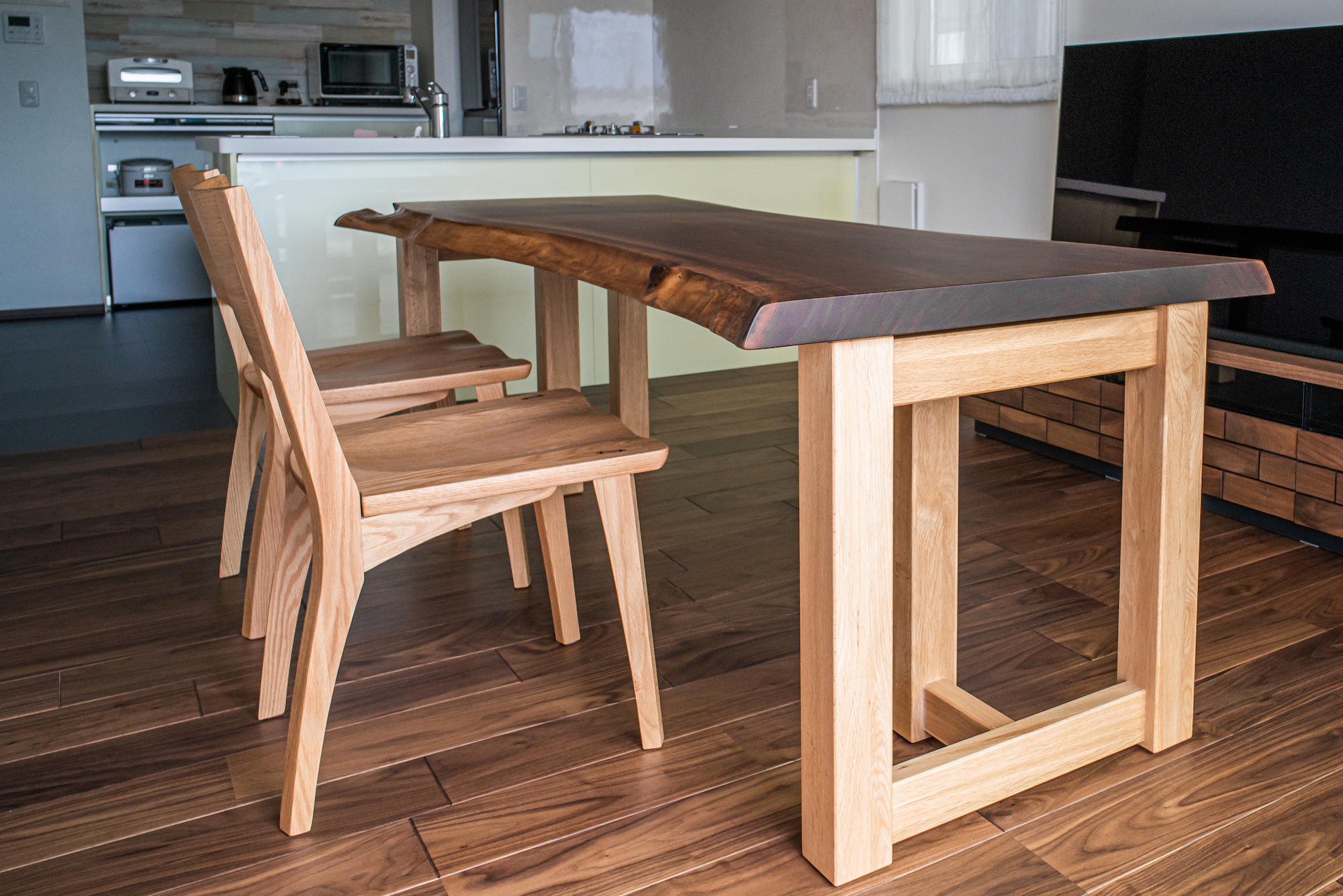 ブラックウォールナット一枚板のダイニングテーブル&オーク(ナラ)無垢材のダイニングチェアをお届けしました。丸太のうねりをそのまま活かした長尺の天板は迫力抜群!人為的な加工では表現できない唯一無二の存在感です。脚部と椅子にはオーク(ナラ)無垢材をお選びいただき、重すぎない自然な組み合わせになりました。