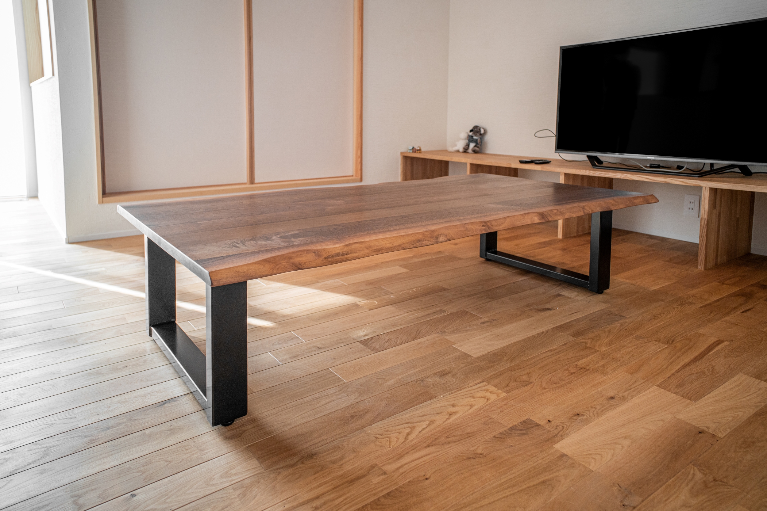 ブラックウォールナット無垢材の座卓をお届けしました。原木の表面の表情を残した“耳付き”と呼ばれる、味わい深い仕上げが特長の一枚です。脚はスチールを合わせてご用意させていただき、質量感のある雰囲気に仕上がりました。