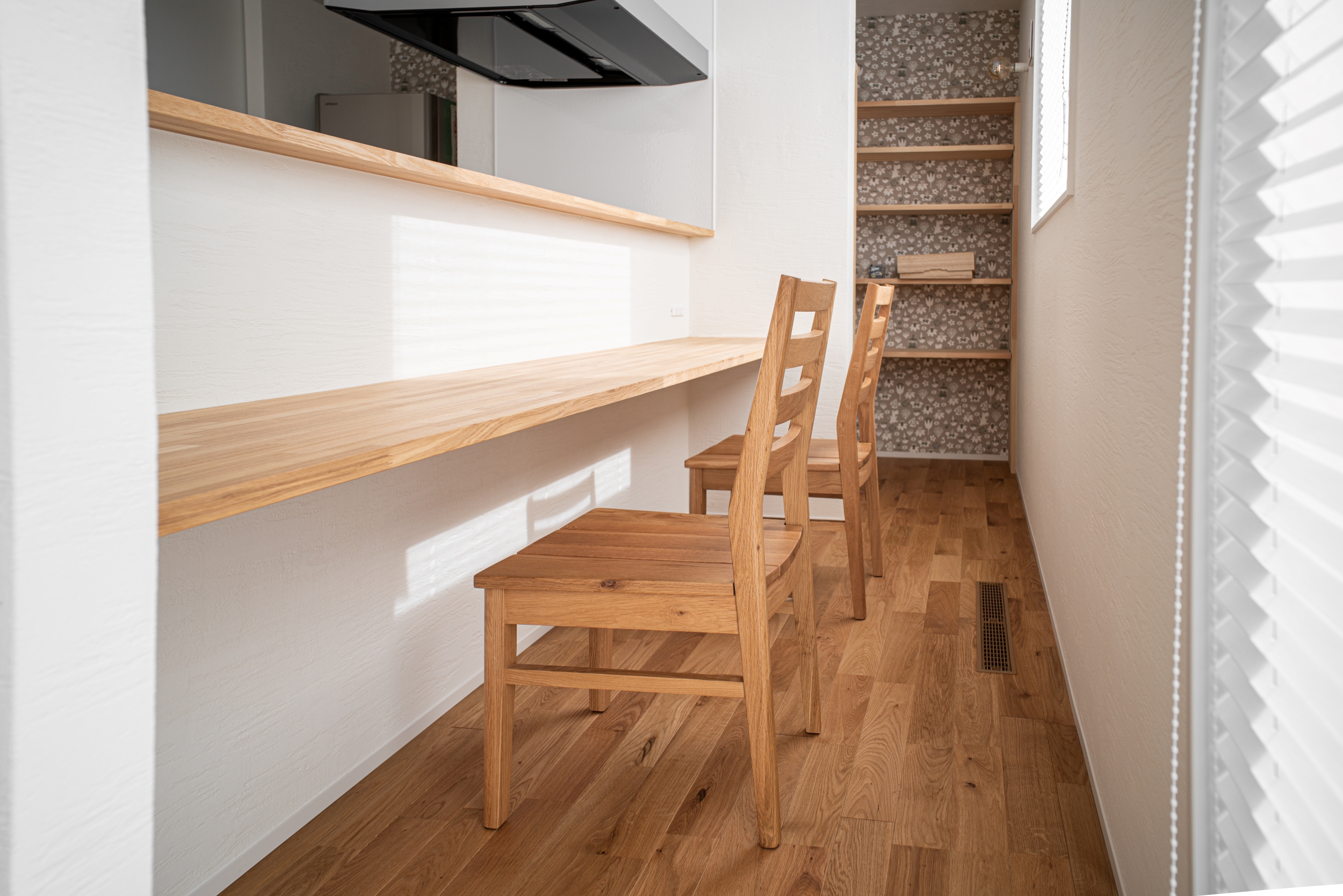 カウンターには、オーク無垢材のダイニングチェアを2脚合わせてお選びいただきました。日当たりもよく横幅のあるカウンターで、ゆったりとした時間を気持ちよくお過しいただけそうですね!