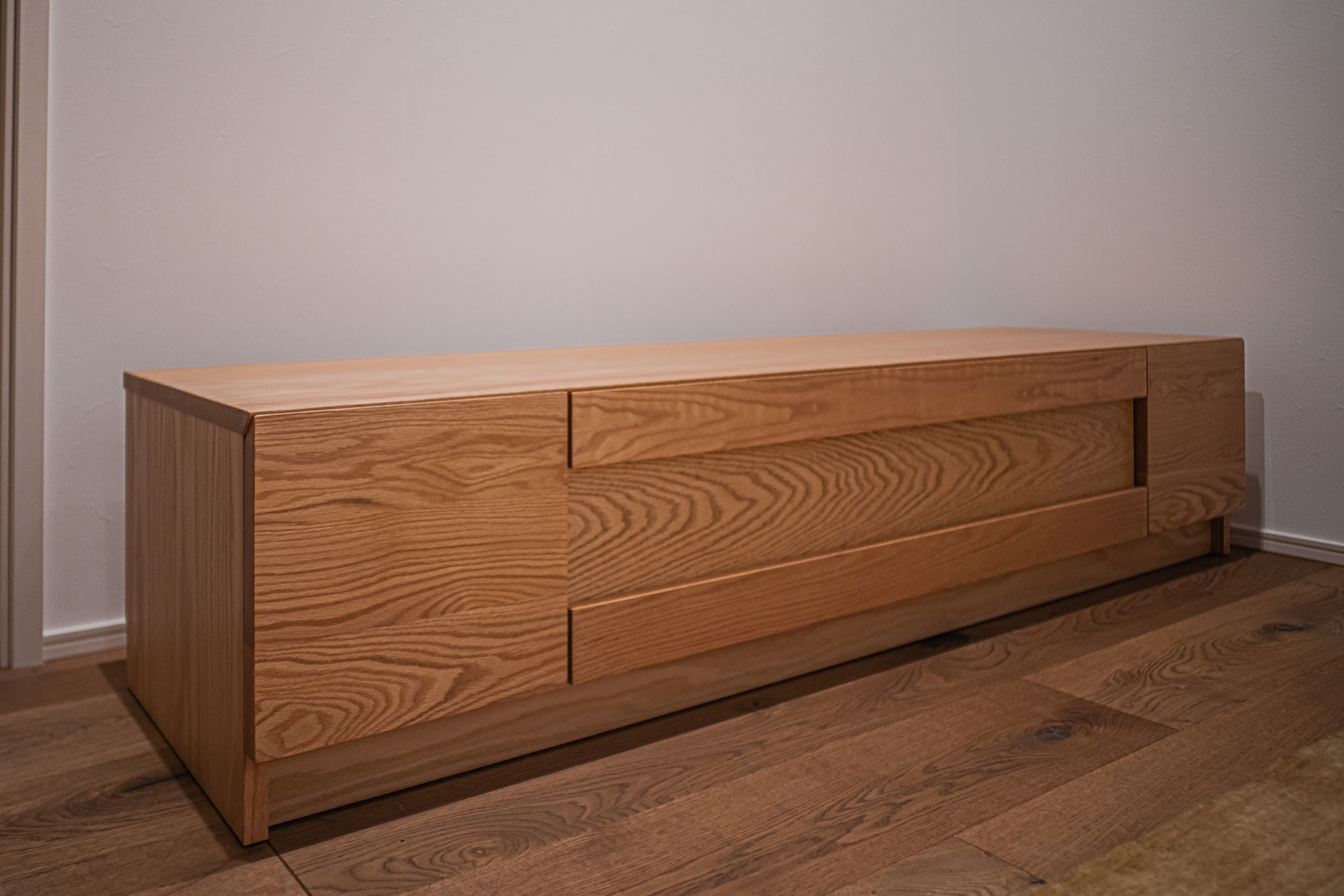 ナラ(オーク)無垢材のTVボードをお届けしました。シンプルを極めたデザインで、無垢材の質感が存分に味わえる人気のモデルです。前板には裏側にガラスを仕込んであり、閉じたままでもリモコンを使えるのも嬉しいポイント。木目を活かした仕上げのフローリングとも相性抜群ですね!