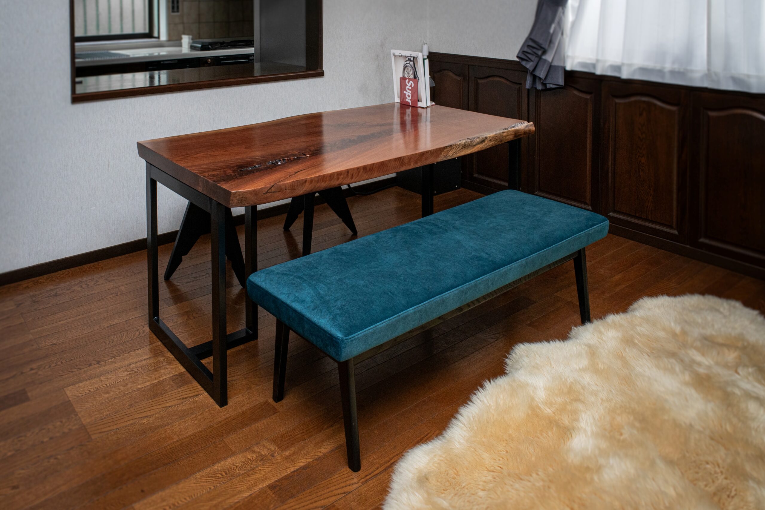 以前ご購入いただいたブラックウォールナット一枚板のダイニングテーブルに合わせるベンチをお届けしました。木部はナラ(オーク)無垢材のブラック塗装、クッションの生地には鮮やかなターコイズブルーを合わせていただき、無垢材の質感とモダンな印象が組み合わさったスタイリッシュな仕上がりになりました。