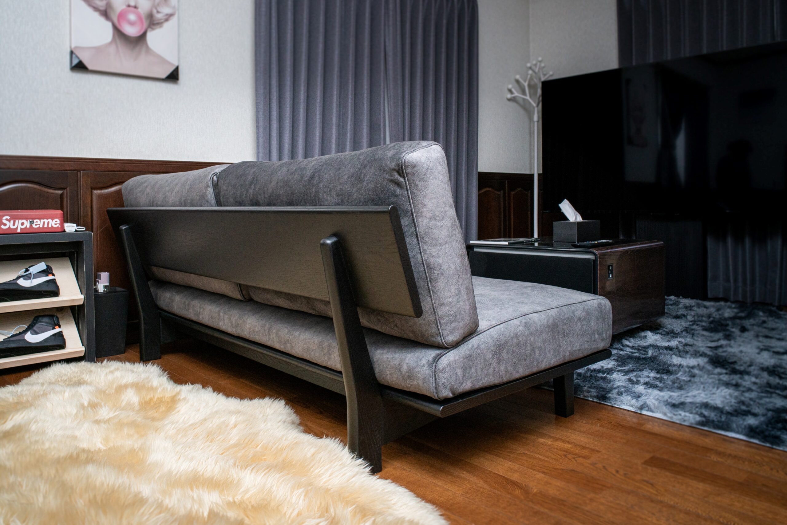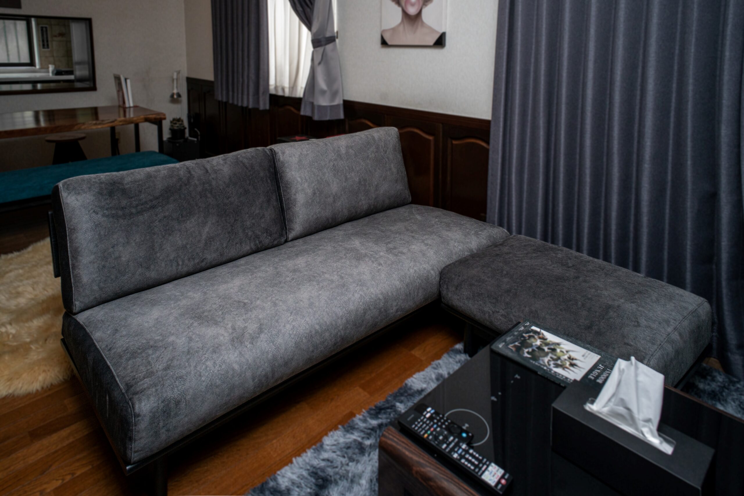 リビングスペースにはナラ(オーク)無垢材のブラック塗装フレームにてソファセットをご用意させていただきました。明るい木目が特徴のオーク材も、ブラック塗装にすると全く違う印象で楽しむことができます。こちらも光沢のある生地で色味を抑えた組み合わせをお選びいただき、艶っぽい雰囲気が格好いい仕上がりになりました。