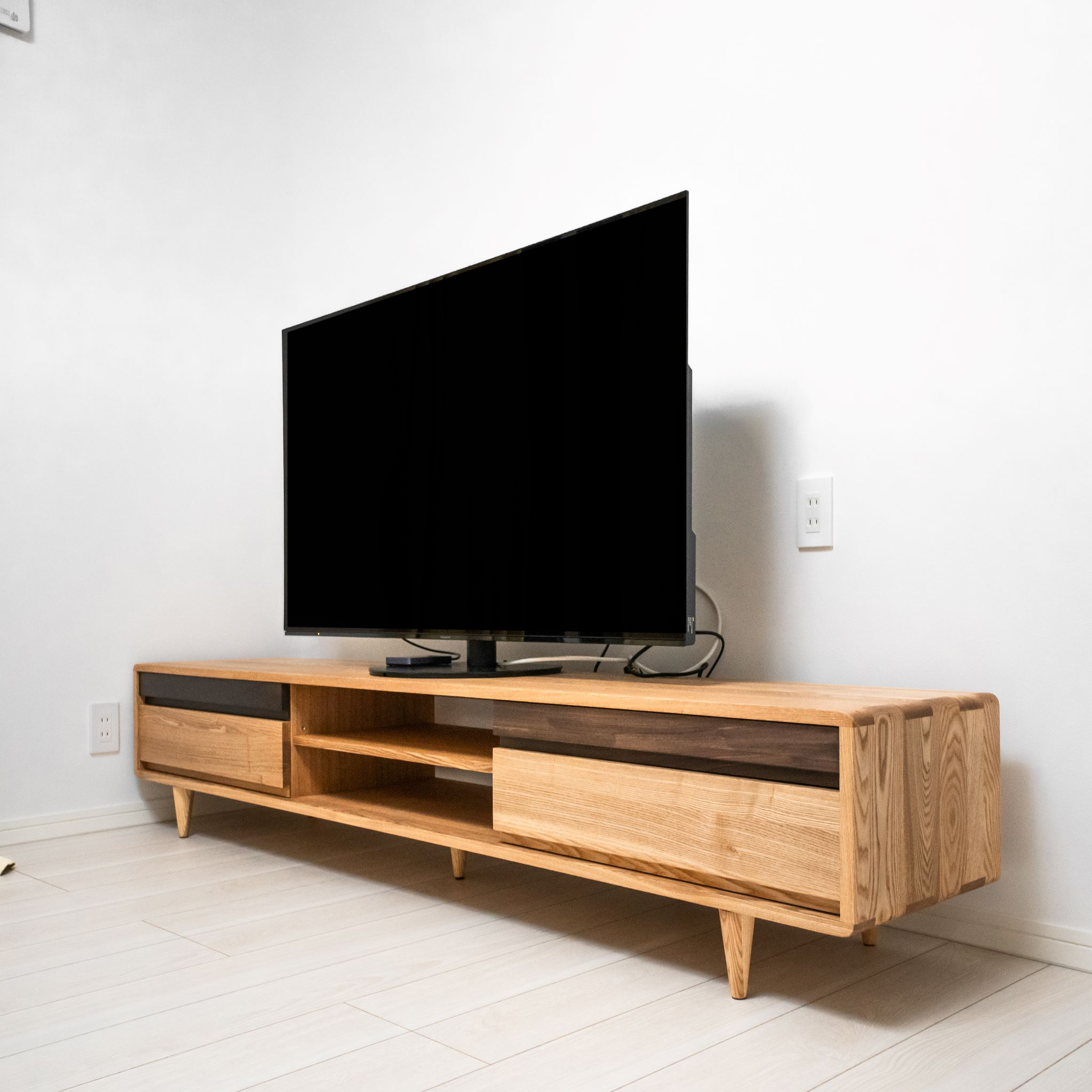タモ(アッシュ)×ブラックウォールナット無垢材のテレビボードをお届けしました。各部のパーツに丸みのある可愛らしいデザインながら、幅2000のサイズは存在感たっぷりです。大型テレビの迫力を、足元でしっかりと支えてくれる組み合わせになりました。