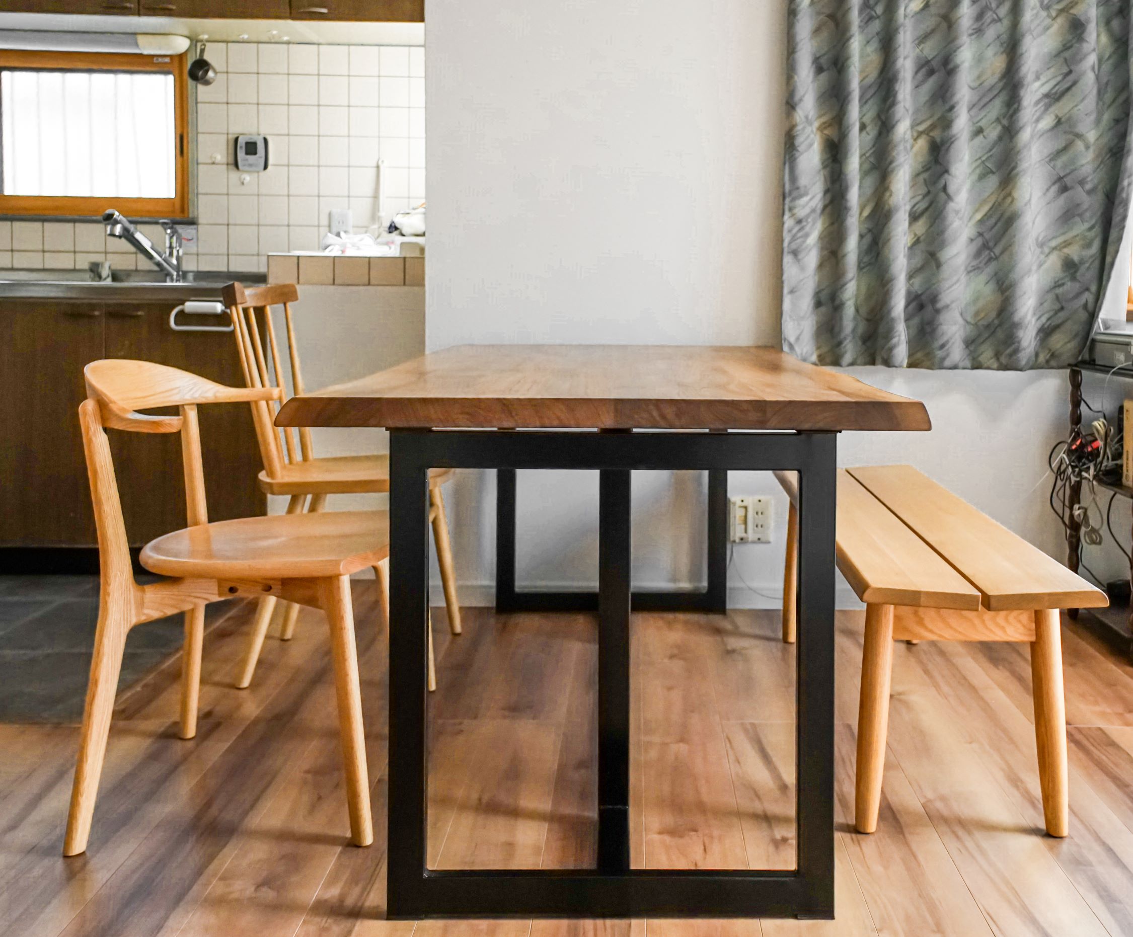 ブラックウォールナット無垢材とオーク(ナラ)無垢材のダイニングセットをお届けしました。厚み45㎜の天板は、耳付きの風合いもあって存在感たっぷり!鉄製の重厚感ある脚もよく似合います。椅子とベンチはナラ(オーク)で明るく統一してお選びいただき、無垢材同士のコントラストが綺麗な組み合わせに仕上がりました。