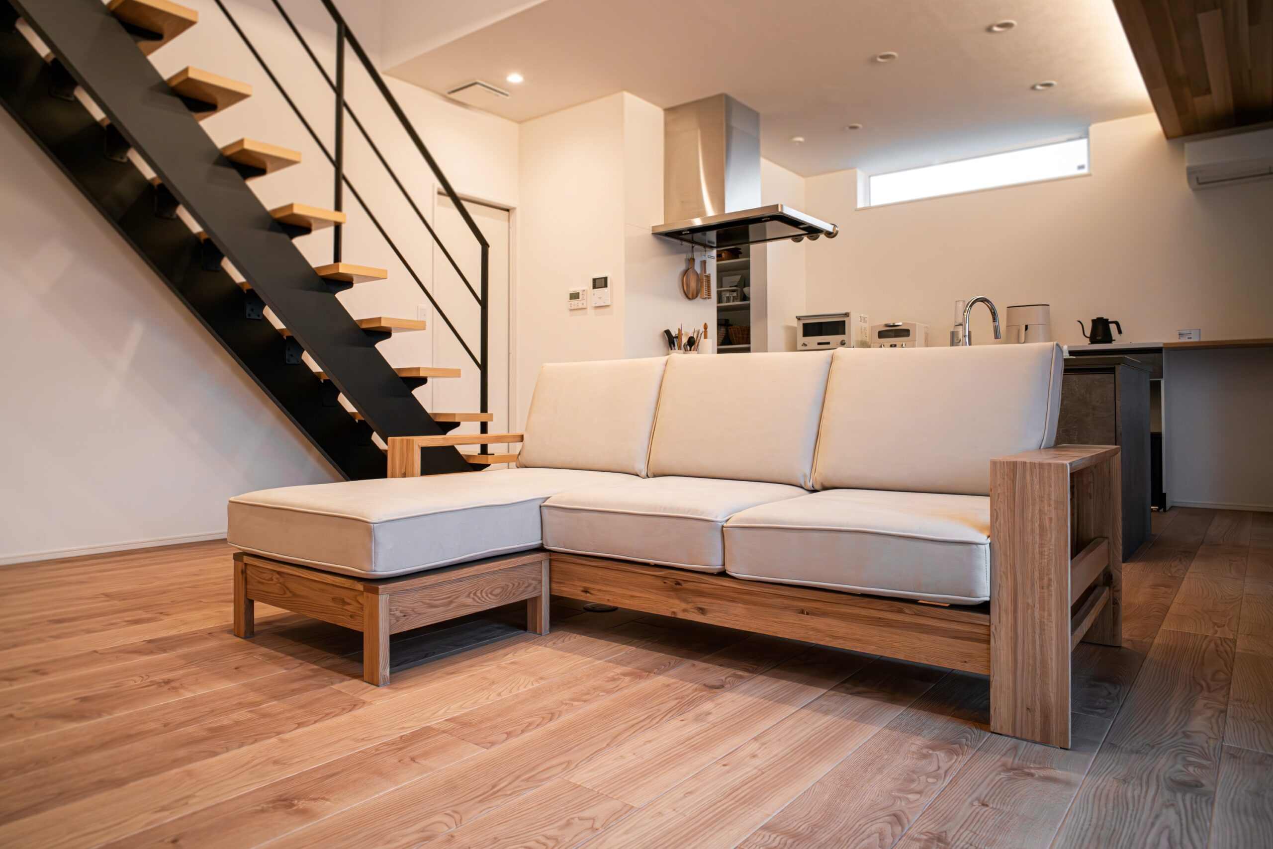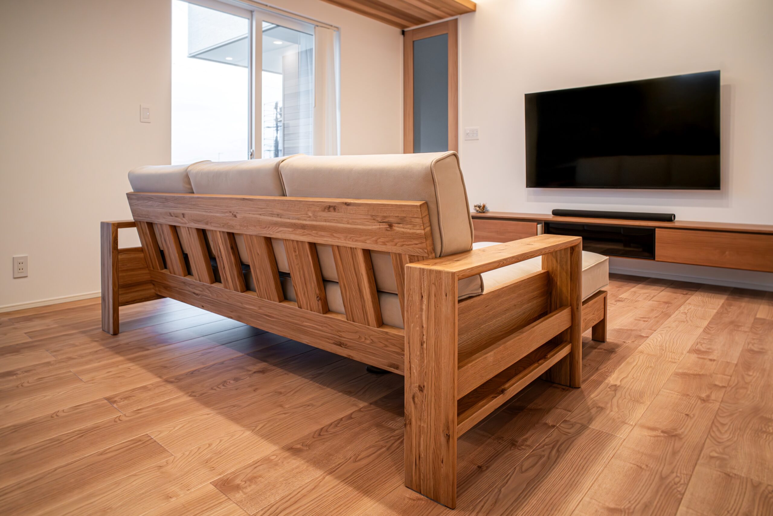 ナラ(オーク)無垢材のソファをお届けしました。ボリューム感のある無垢材フレームは、前から見ても後ろから見ても迫力たっぷり!幅広の肘掛けはお飲み物やスマートフォンを置いておくのにも重宝します。明るい印象の空間に、清潔感のあるオフホワイトのクッションも良く似合っていますね。