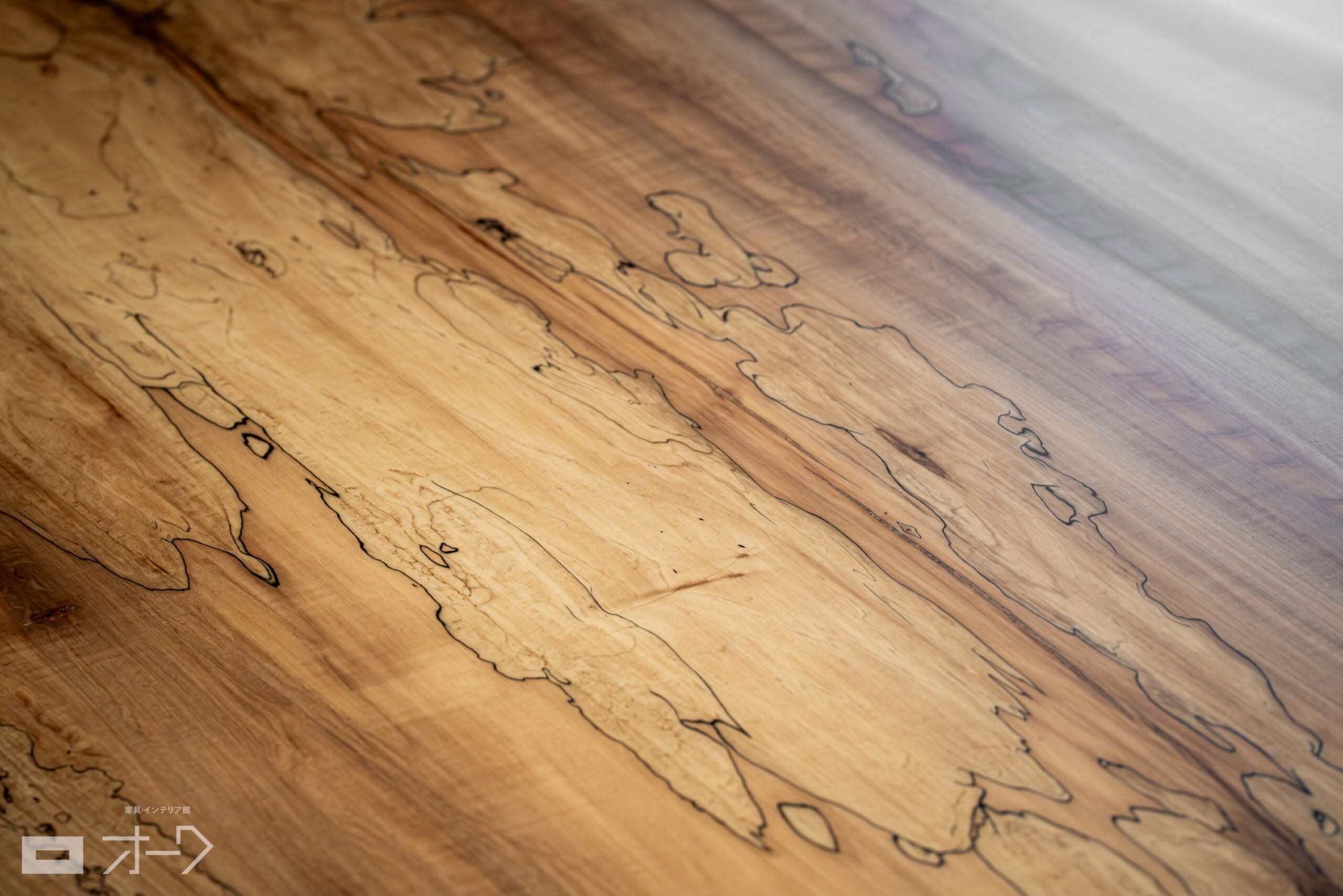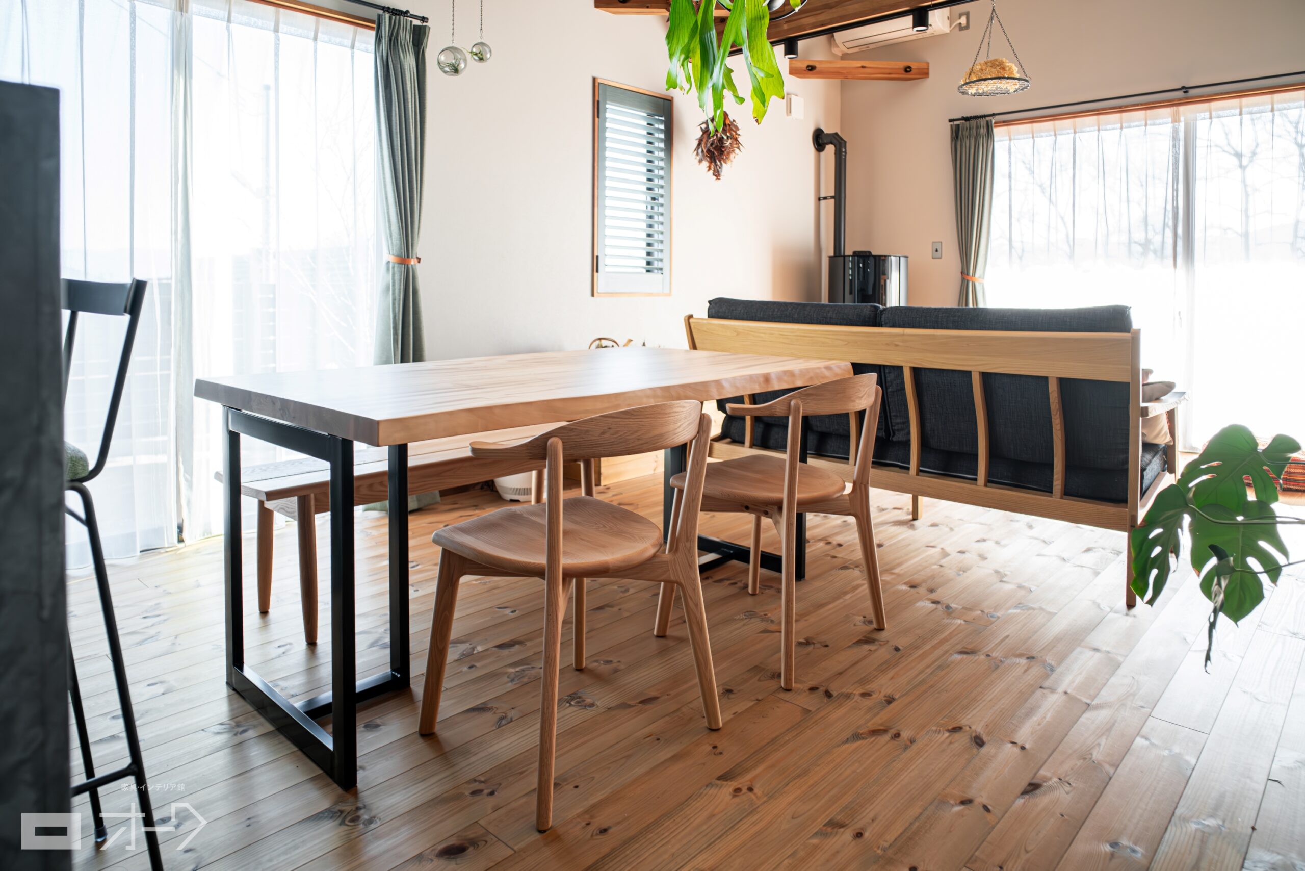 栃(トチ)一枚板のダイニングテーブルと、ナラ(オーク)無垢材の椅子&ベンチをお届けしました。きめの細かい木肌が美しく、国産材の代表格として人気の高い栃ですが、こちらはその中でも“スポルテッド”という模様の入った珍しい一枚です。自然の経過の中で稀に現れる黒っぽい筋状の模様は、古くから装飾品などに用いられてきました。真っ白な木肌とのコントラストが唯一無二の存在感を有しており、一度見たら忘れられない印象を与えてくれます。椅子&ベンチは、天板の迫力を邪魔しないようにナチュラルな色で合わせてお選びいただきました。素敵なお部屋の内装も相まって、ナチュラルな暖かみの中にもクールな格好良さが調和する素敵な空間になりました。