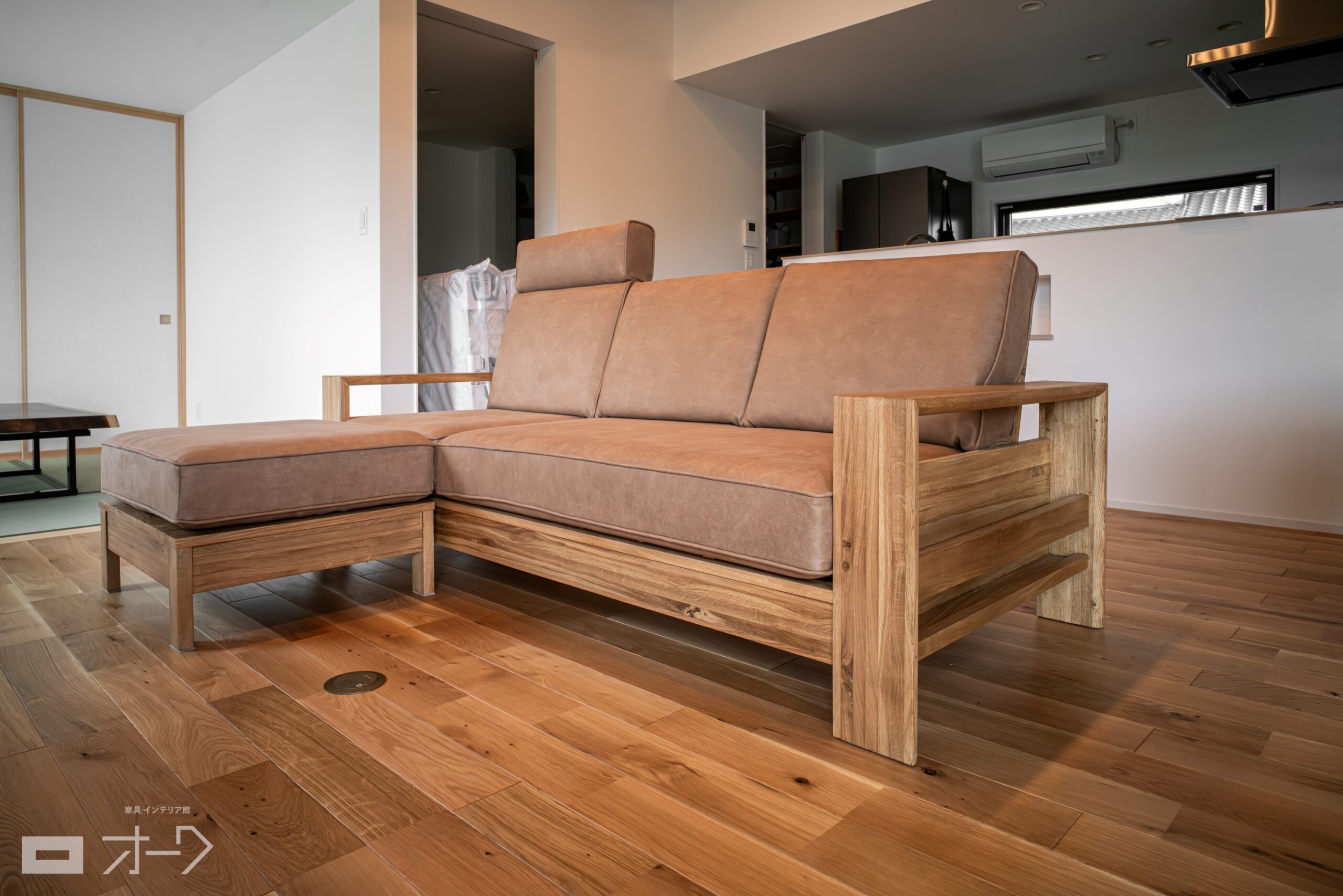 リビングスペースにはナラ(オーク)無垢材のソファをお選びいただきました。幅広の無垢材をふんだんに使っており、重量感と迫力がたっぷり味わえる逸品です。レザー調の質感が特徴的なクッションカバーは同系色の色合いで制作して、落ち着いた印象の仕上がりになりました。
