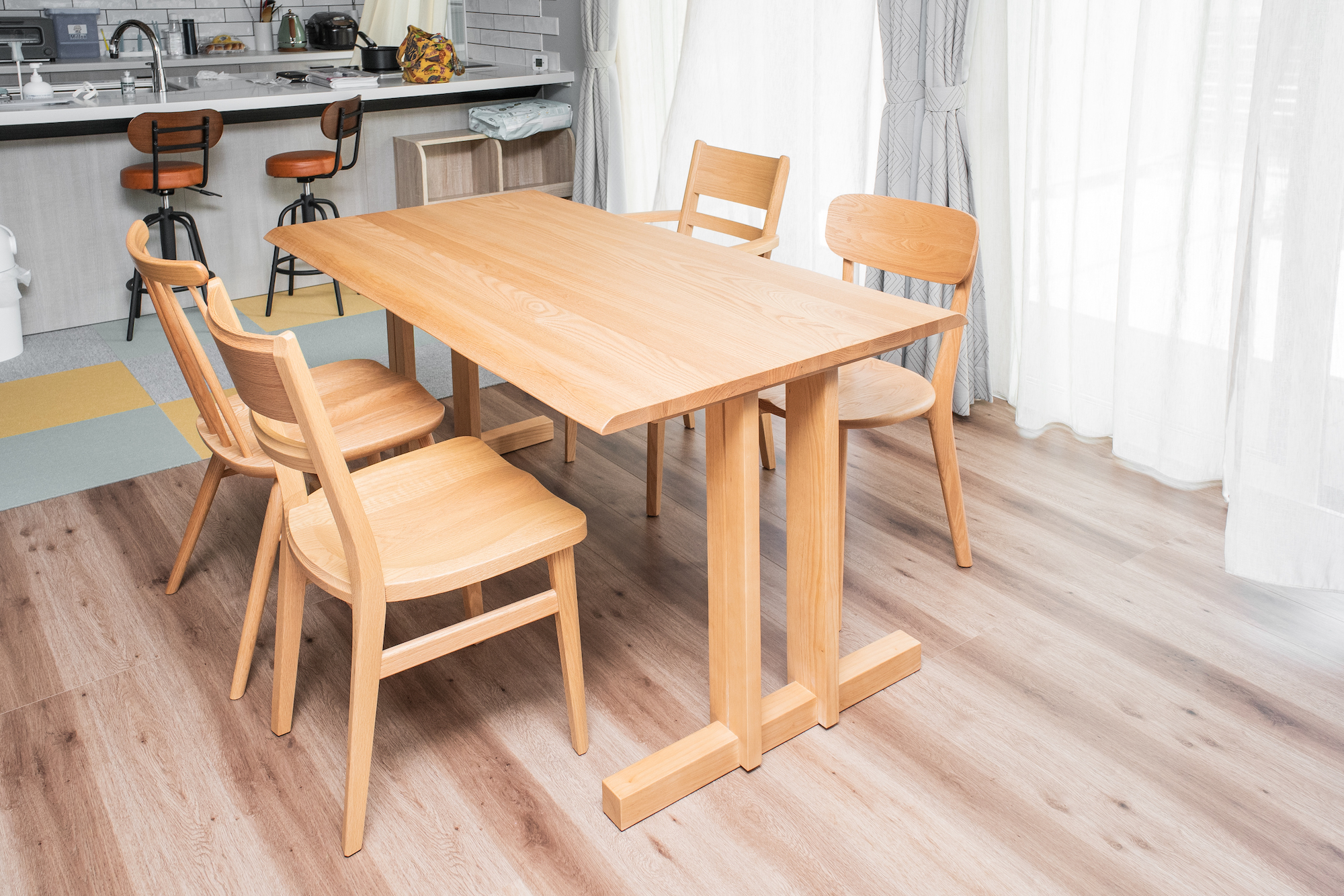 ナラ(オーク)無垢材のダイニングセットをお届けしました。テーブルと椅子の素材を合わせつつ、椅子は4脚それぞれ異なるデザインでお選びいただきました。統一感はありながらも一目でこだわりが感じられる、賑やかな組み合わせになりました。