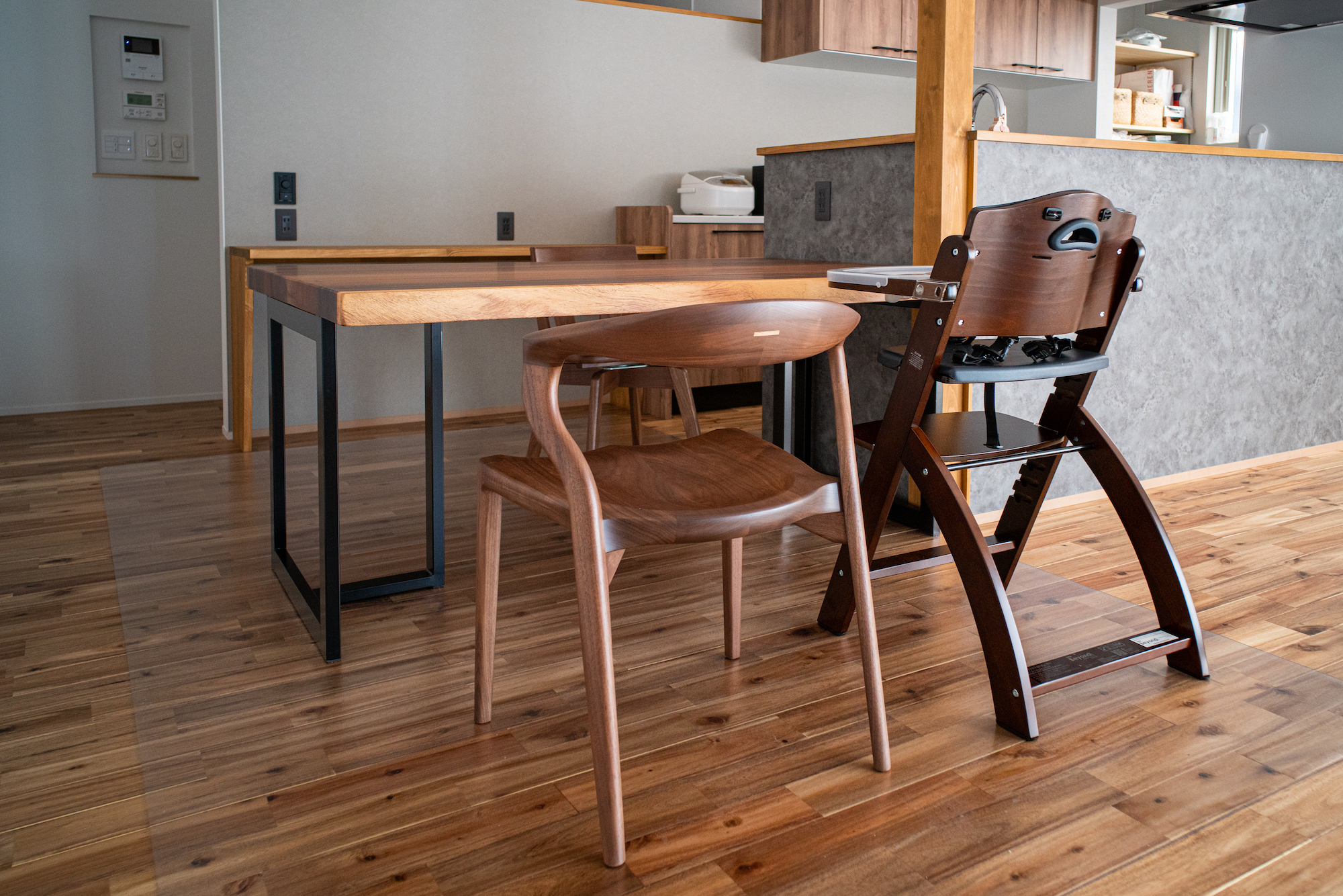 ブラックウォールナット無垢材のダイニングチェアをお届けしました。以前お届けしたモンキーポッド一枚板のダイニングテーブルに合わせてお使いいただけるように、無垢材のボリューム感が味わえるチェアをお選びいただきました。さまざまデザインを組み合わせてもしっくりと収まるのが天然木の椅子の大きな魅力です。