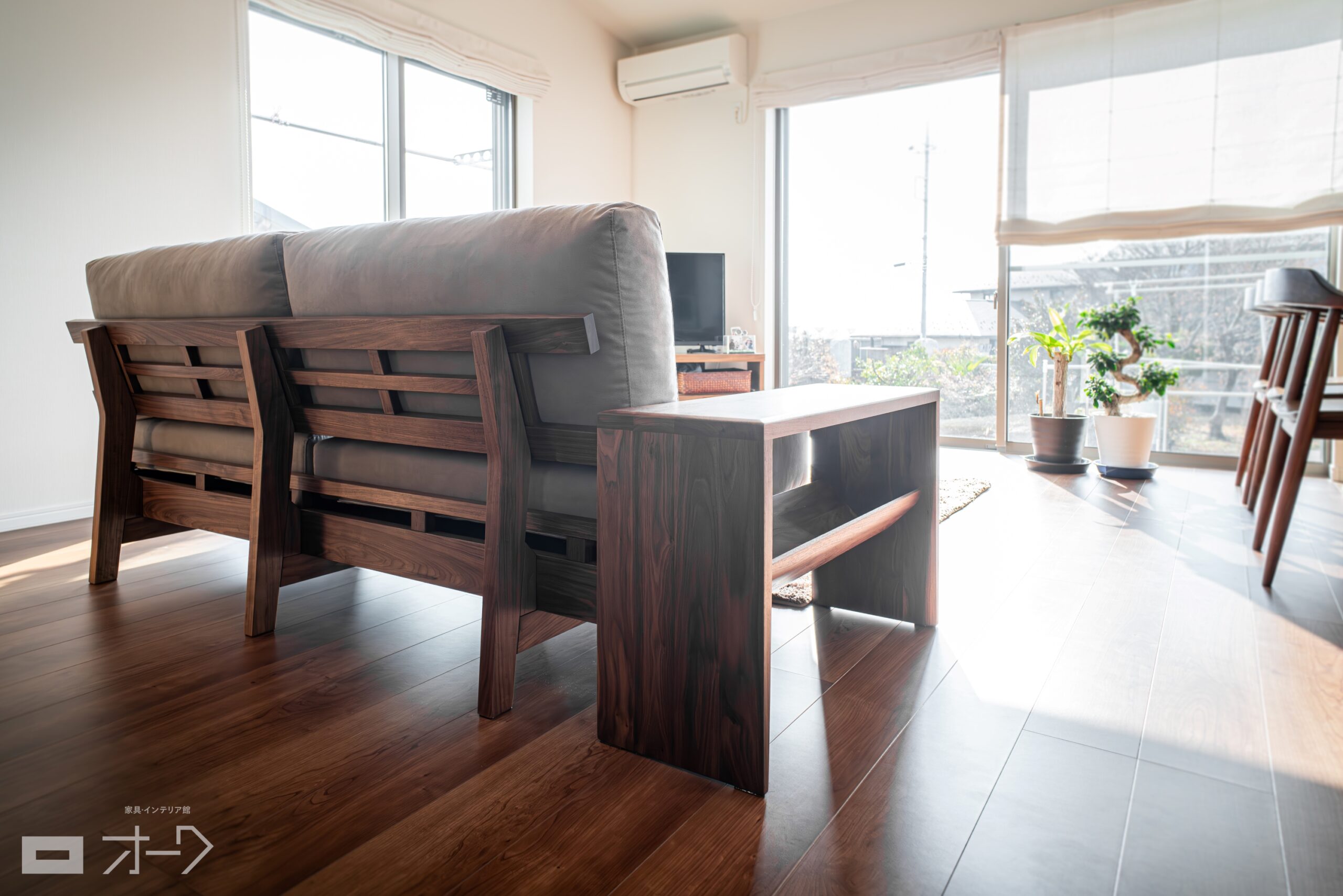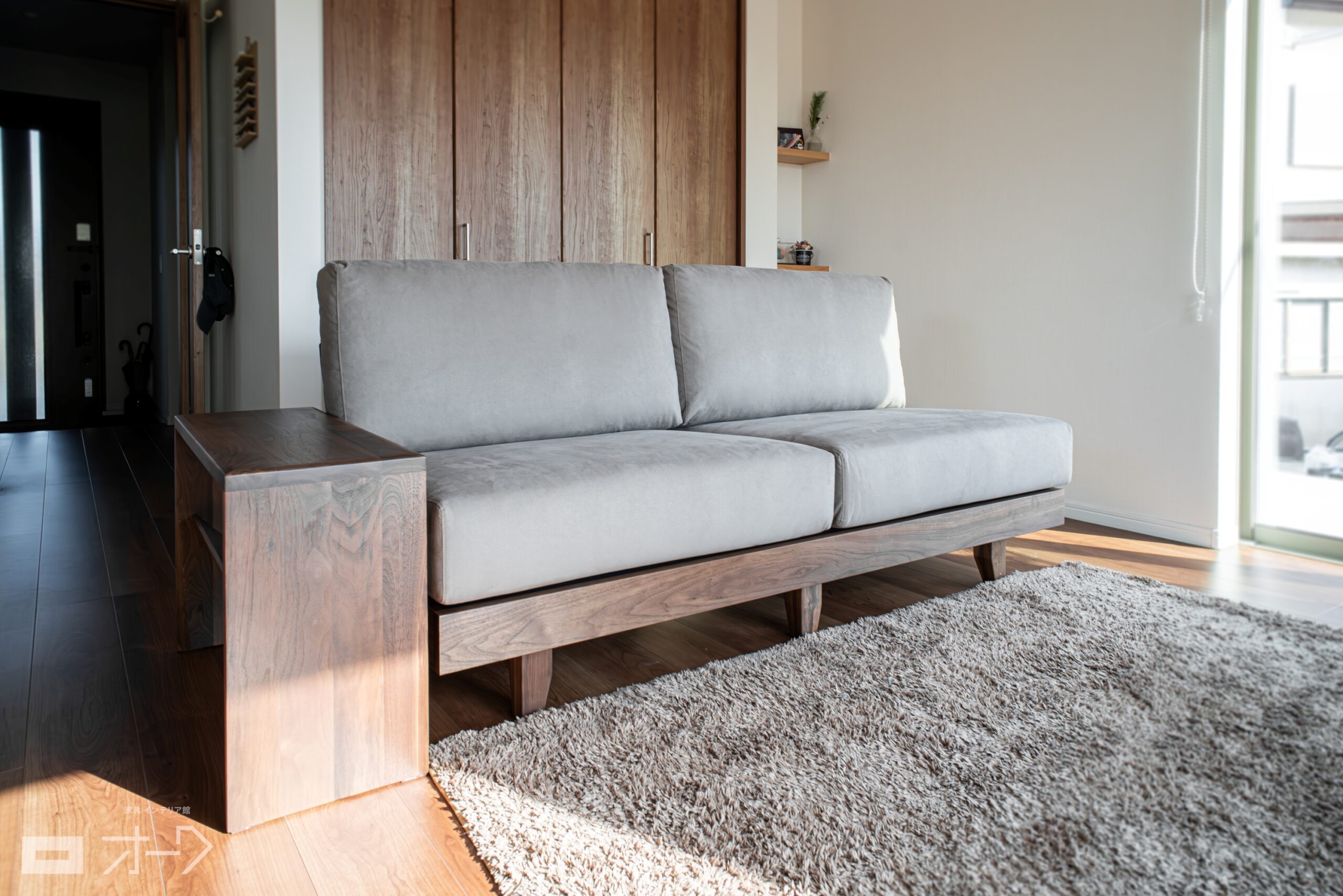 ブラックウォールナット無垢材のソファをお届けしました。組み込んだデザインが特徴的なフレームは、強度面のみならず見た目の美しさも特徴です。スペースシャトルのシートに使用される特殊な低反発ウレタンフォームを用いており、しっとりした座り心地が人気のクッションに、国内最高峰の耐久性とスエードのような高級感を併せ持つディナミカ(旧ラムース)を合わせてお選びいただきました。大きめのサイドテーブルも合わせてご用意させていただき、ゆったりと寛げるリビングスペースが完成しました。