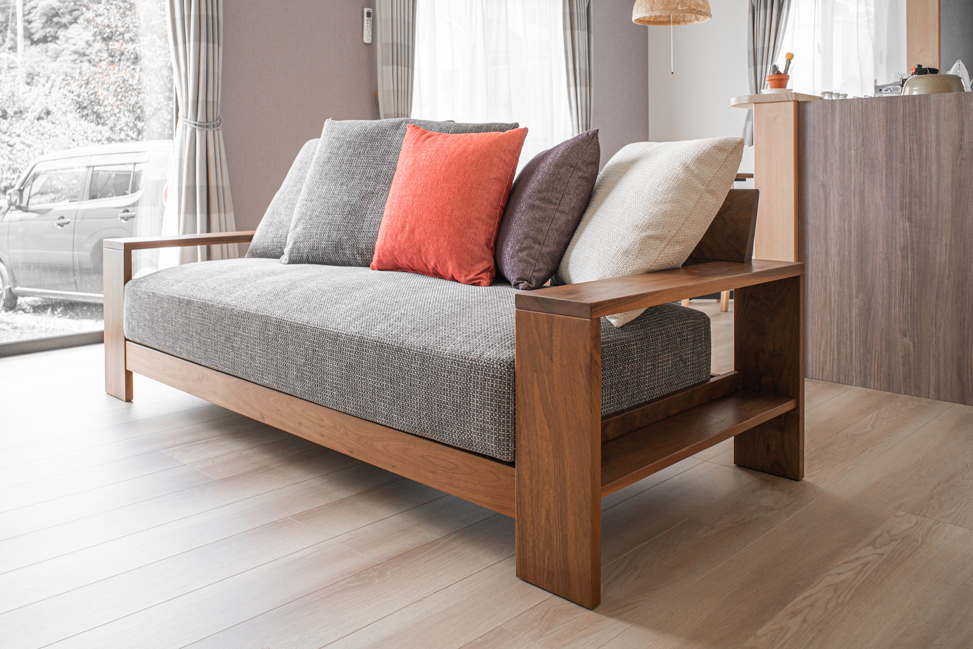 ブラックウォールナット無垢材のソファをお届けいたしました。木工家具としては珍しく、大小さまざまなクッションを組み合わせてお使いいただける仕様です。無垢材の高級感がたっぷりと味わえる、幅広の肘掛けと背板のフレームも迫力のあるデザインです。